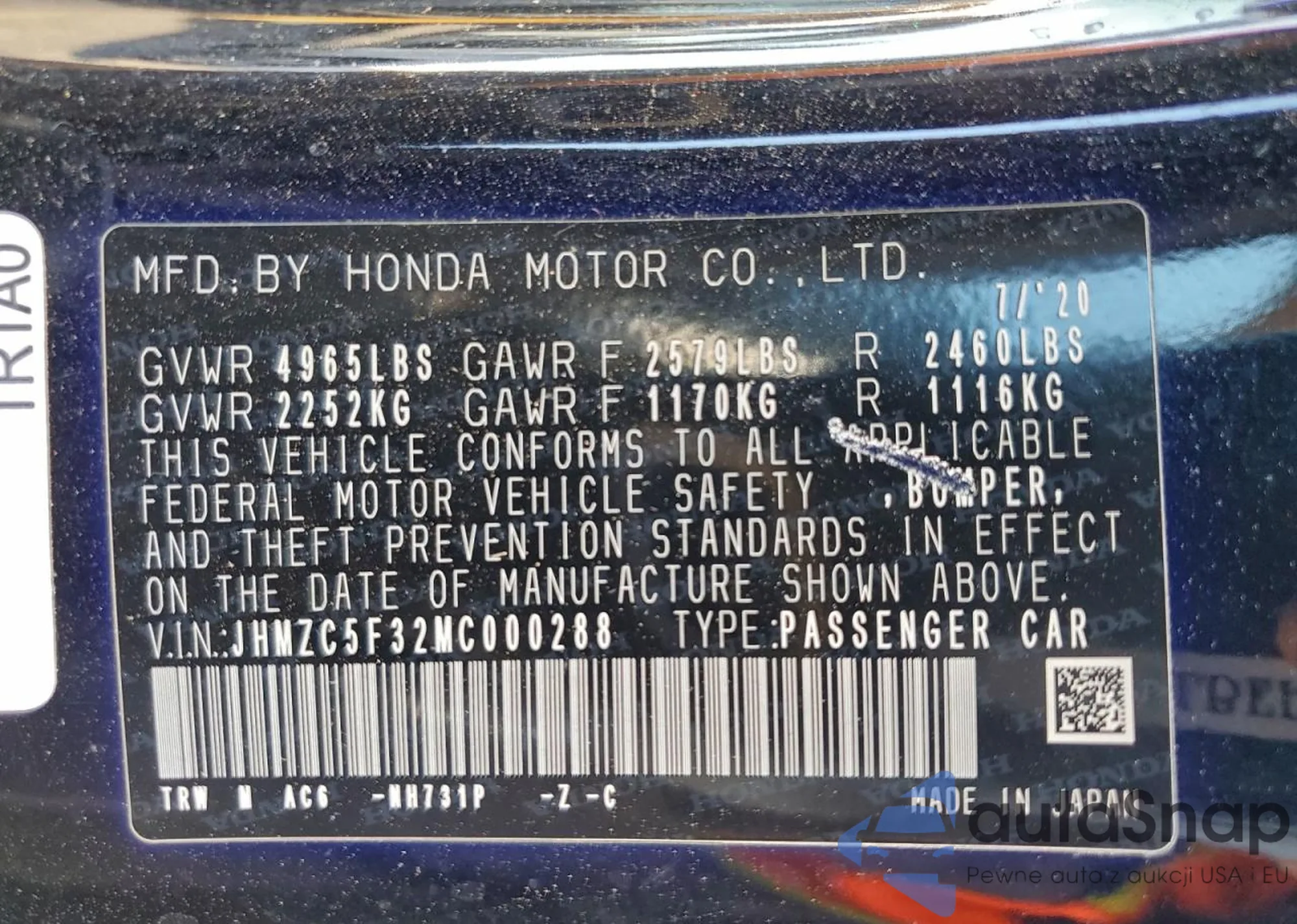 LOT: 72266755 VIN: JHMZC5F32MC000288