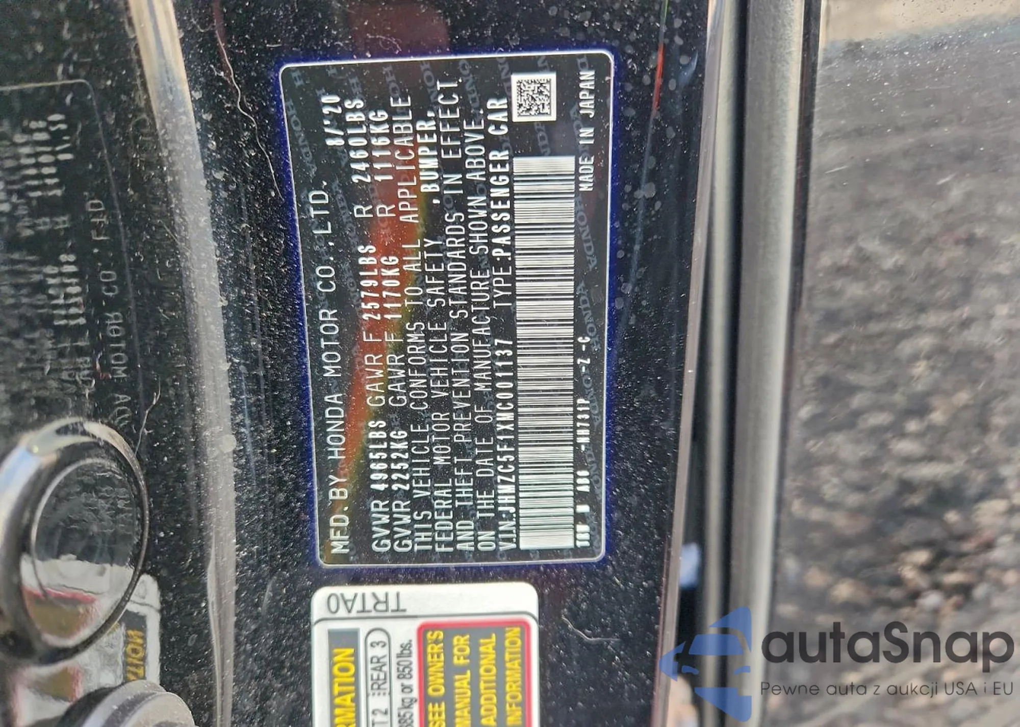 LOT: 99674175 VIN: JHMZC5F1XMC001137