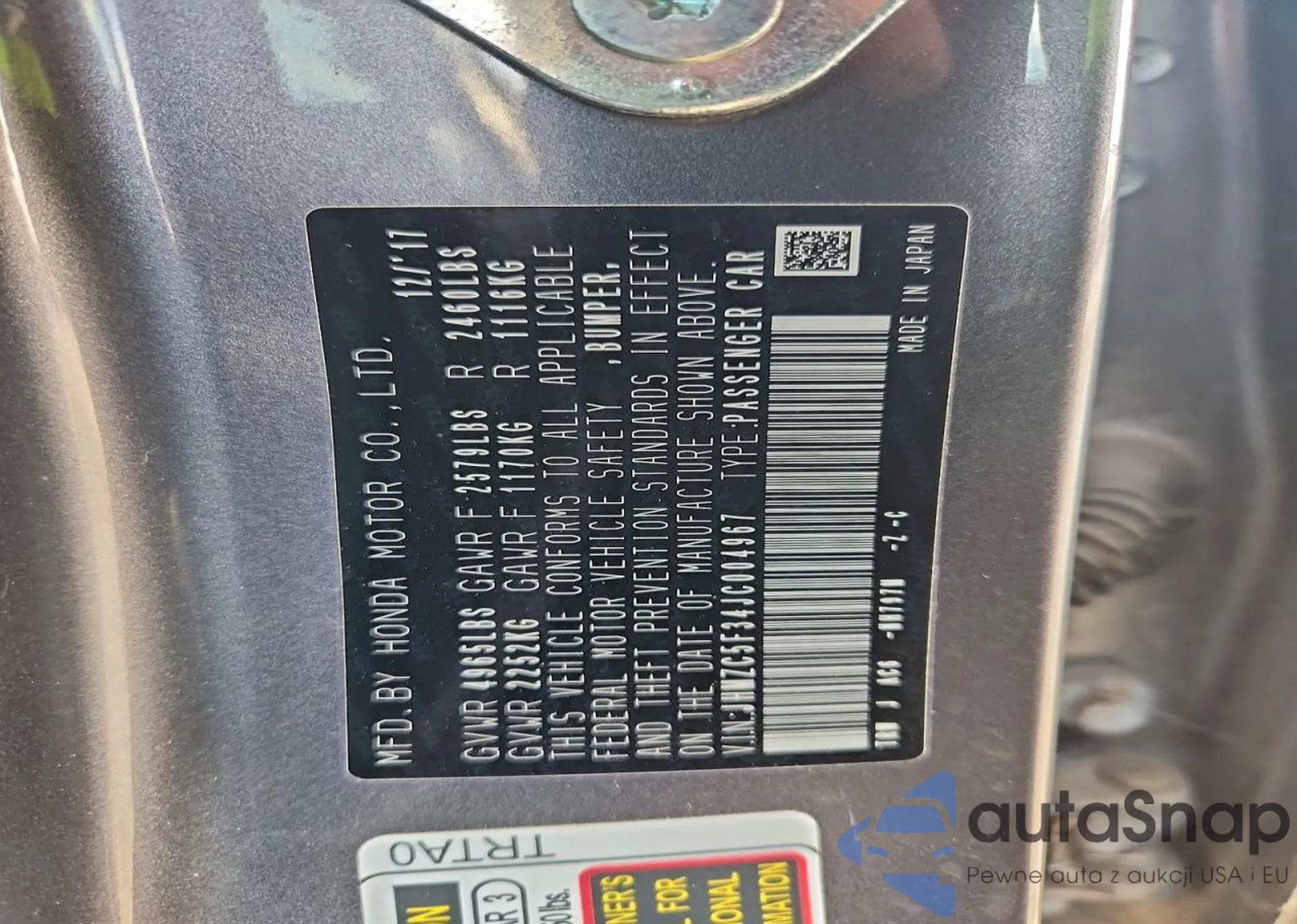 LOT: 72951965 VIN: JHMZC5F34JC004967