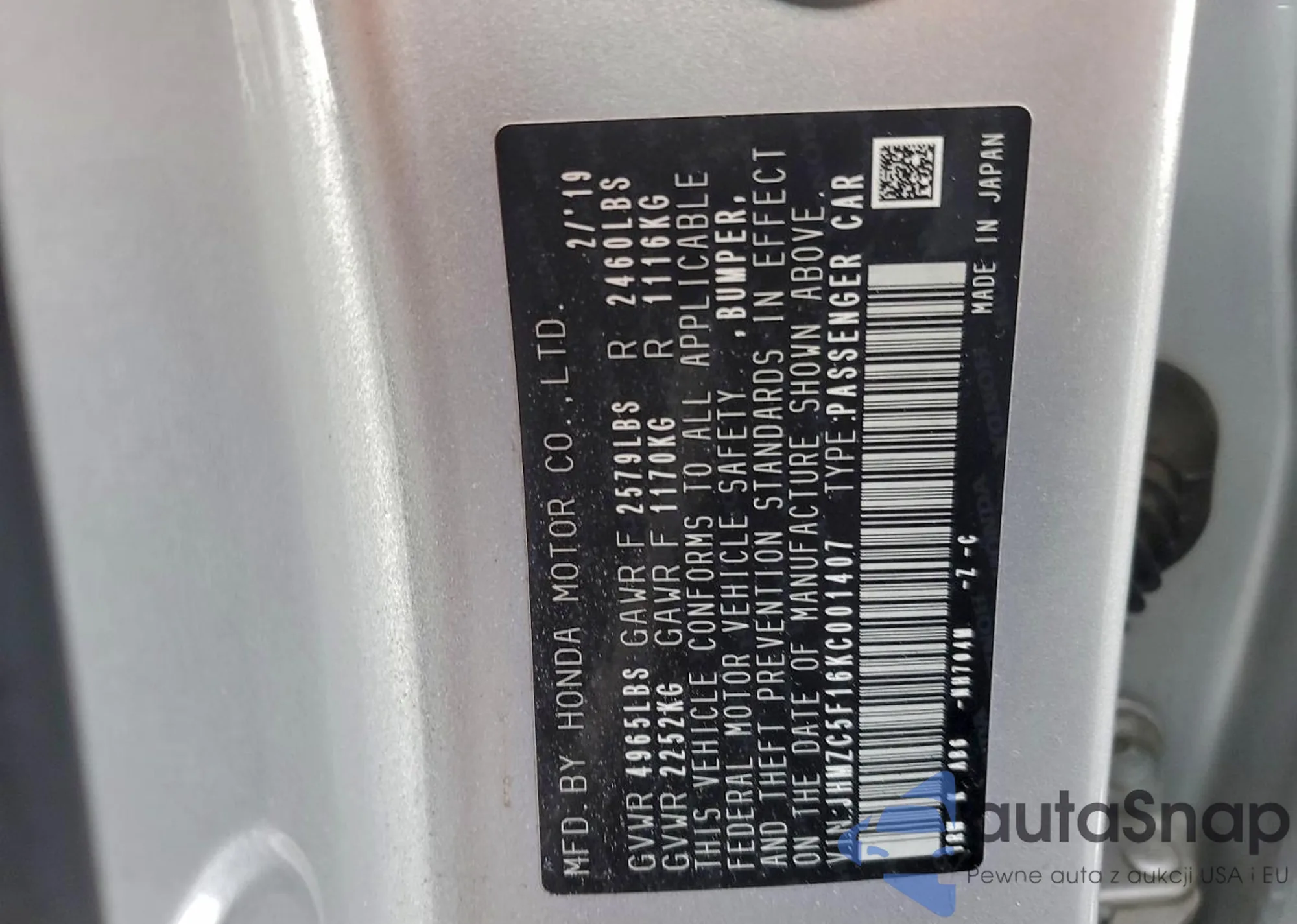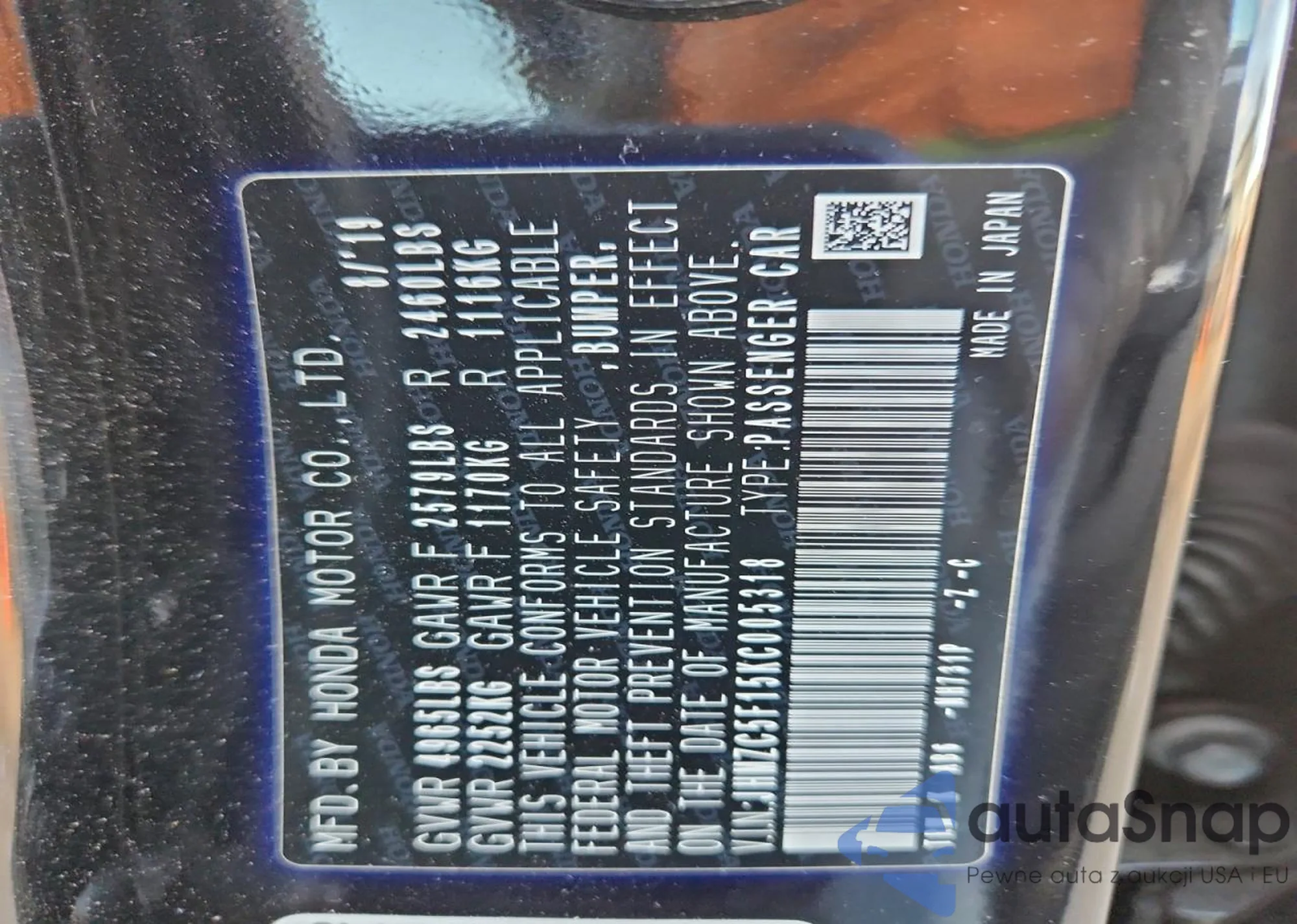 LOT: 99150575 VIN: JHMZC5F15KC005318