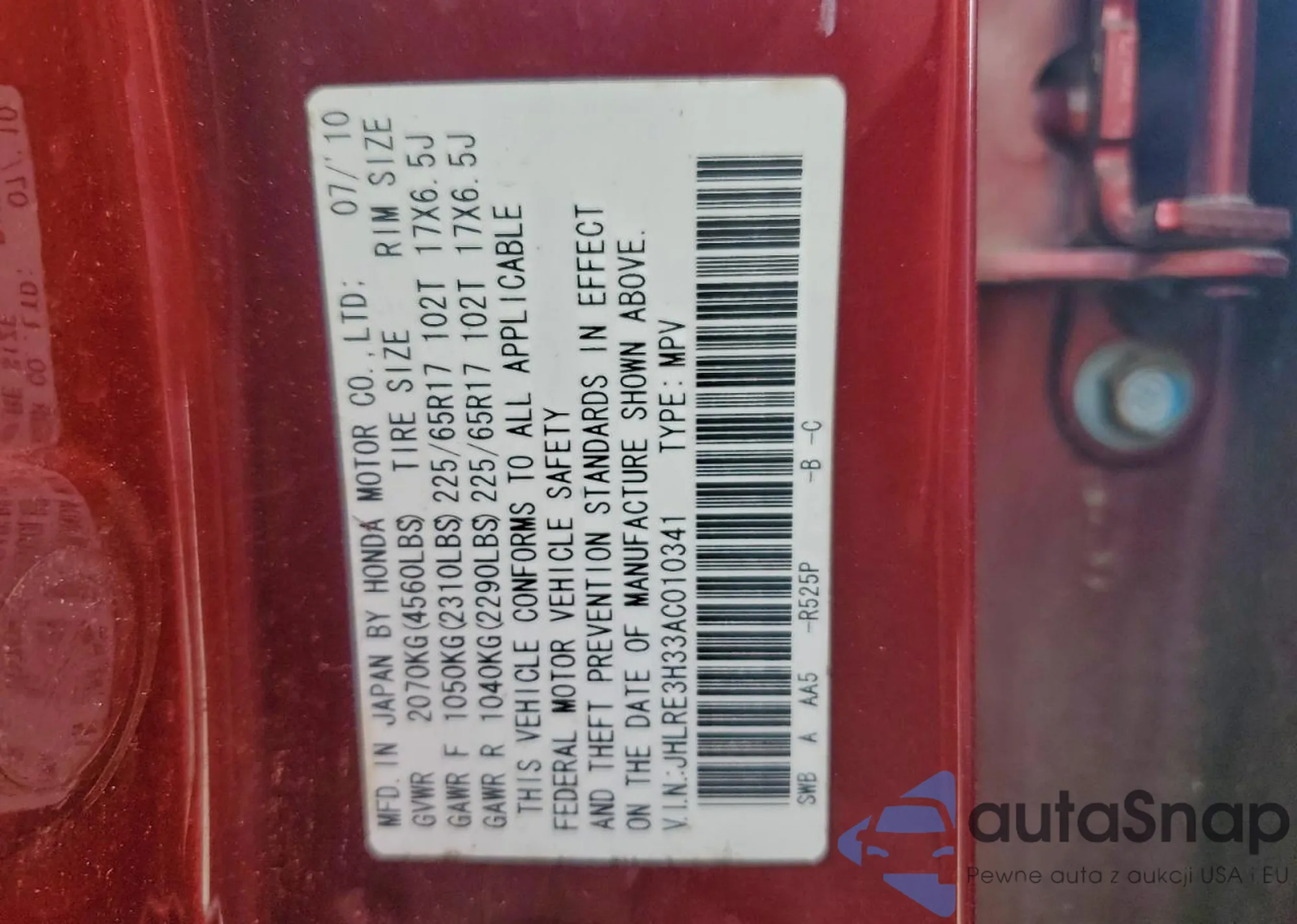 • VIN JHLRE3H33AC010341