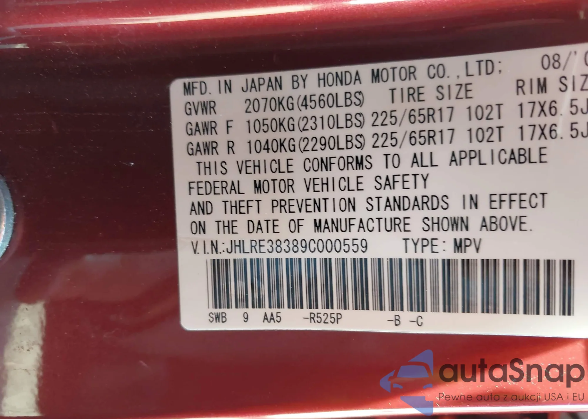 • VIN JHLRE38389C000559