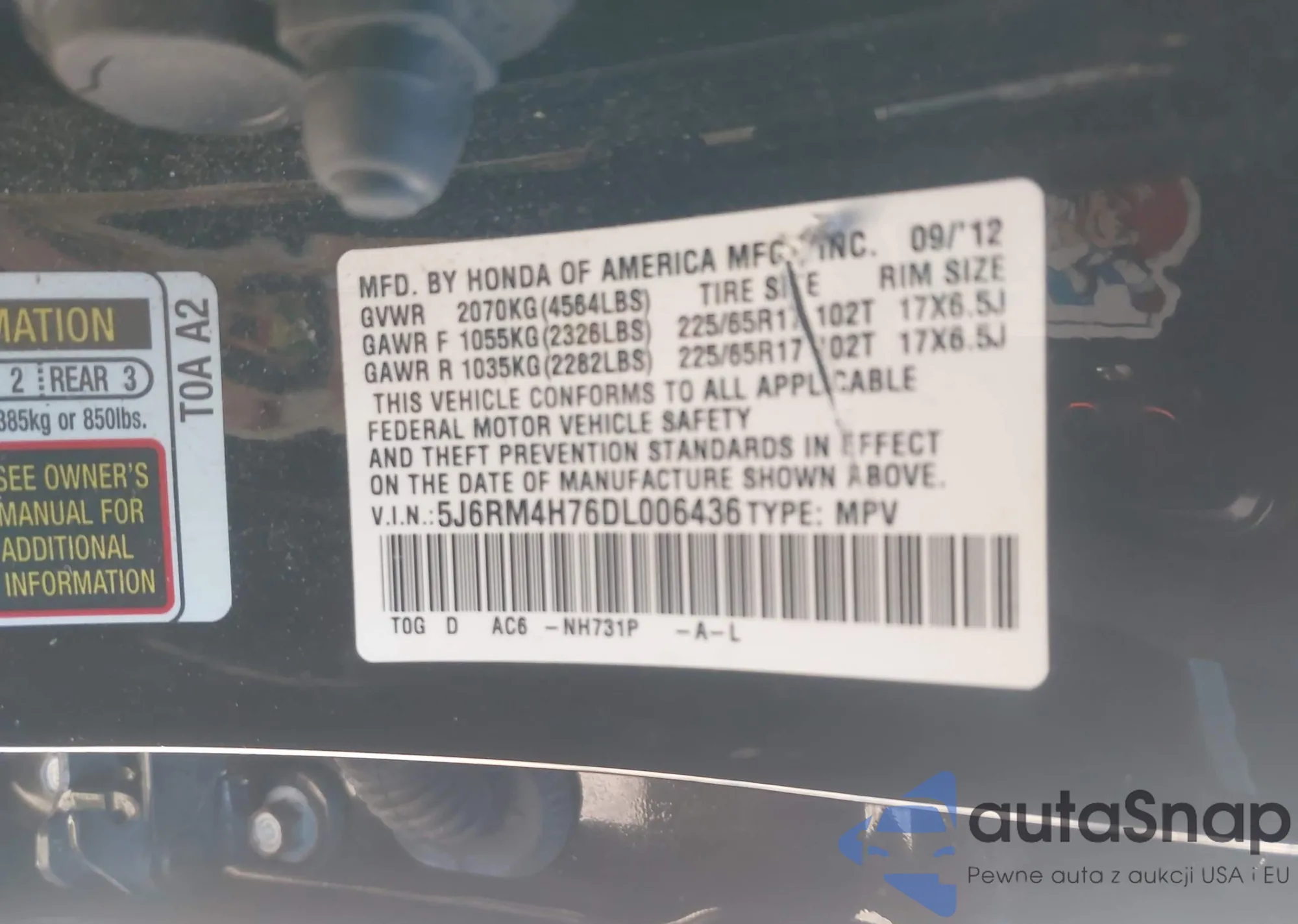 • VIN 5J6RM4H76DL006436