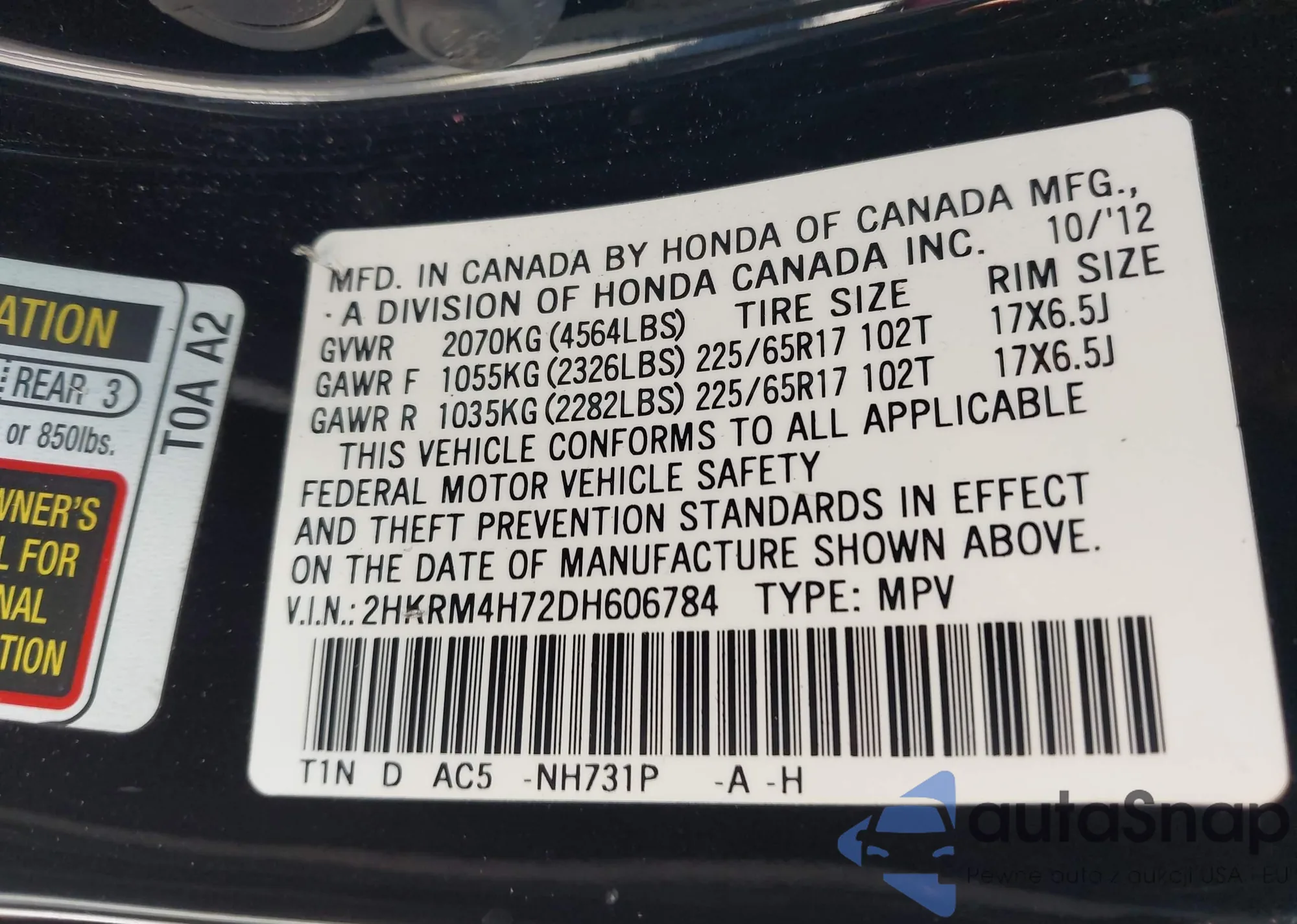 • VIN 2HKRM4H72DH606784