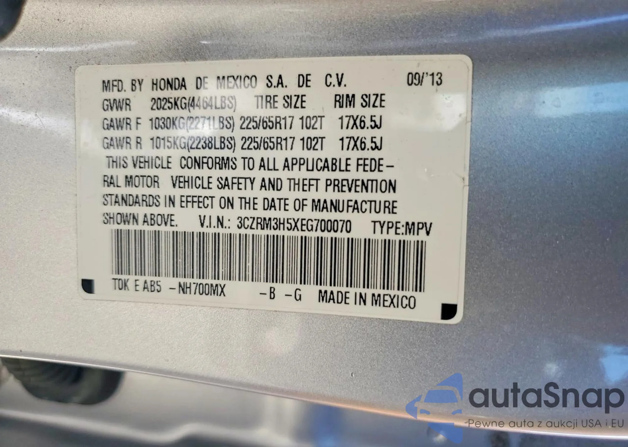 • VIN 2HKRM4H7XFH684068