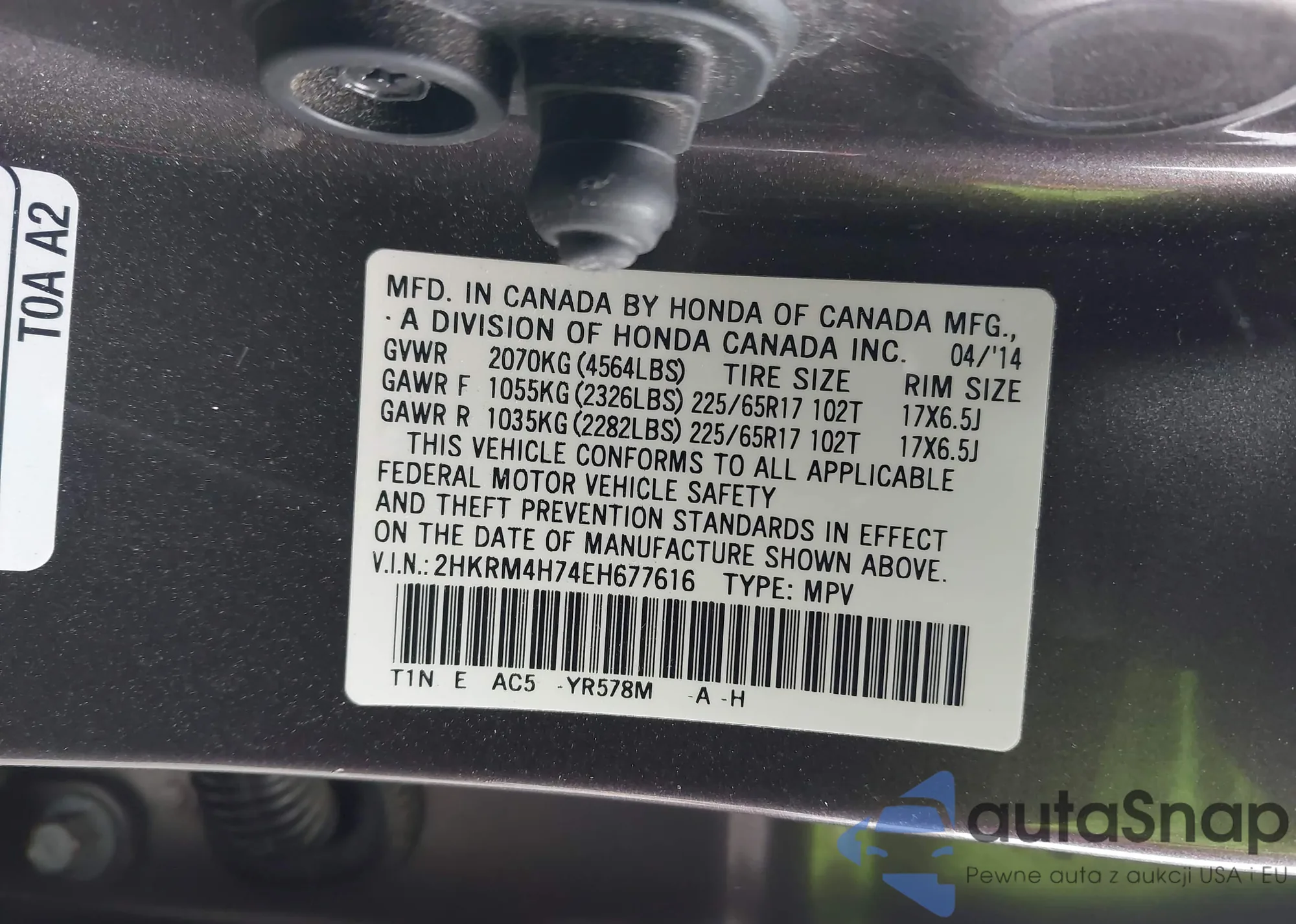 • VIN 2HKRM4H56FH667914