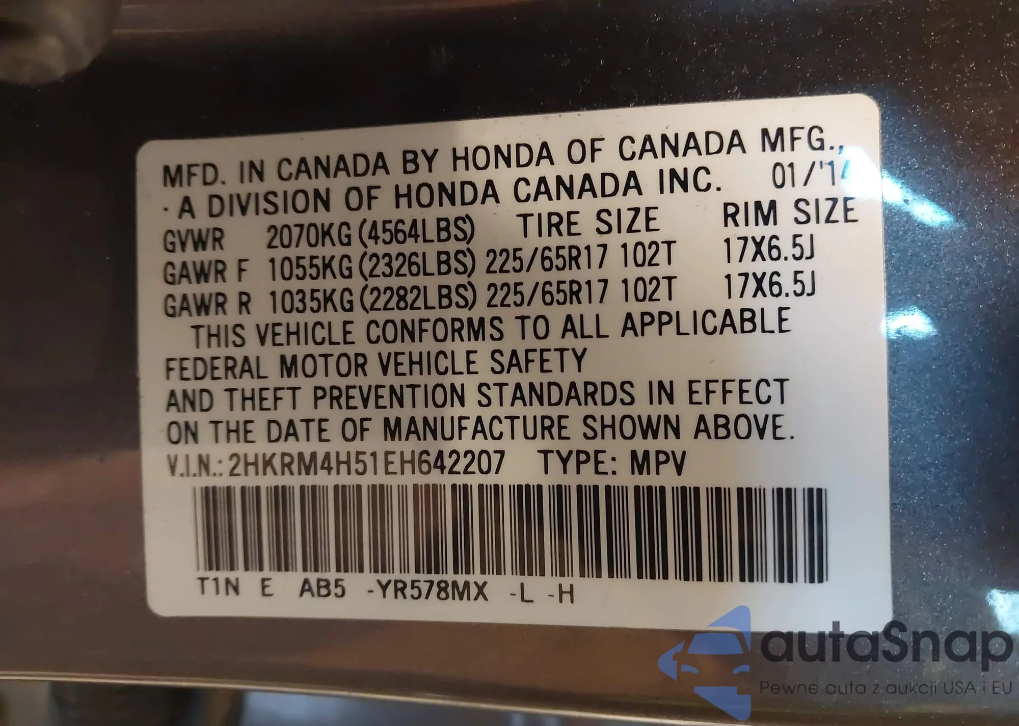 • VIN 2HKRM4H51EH642207