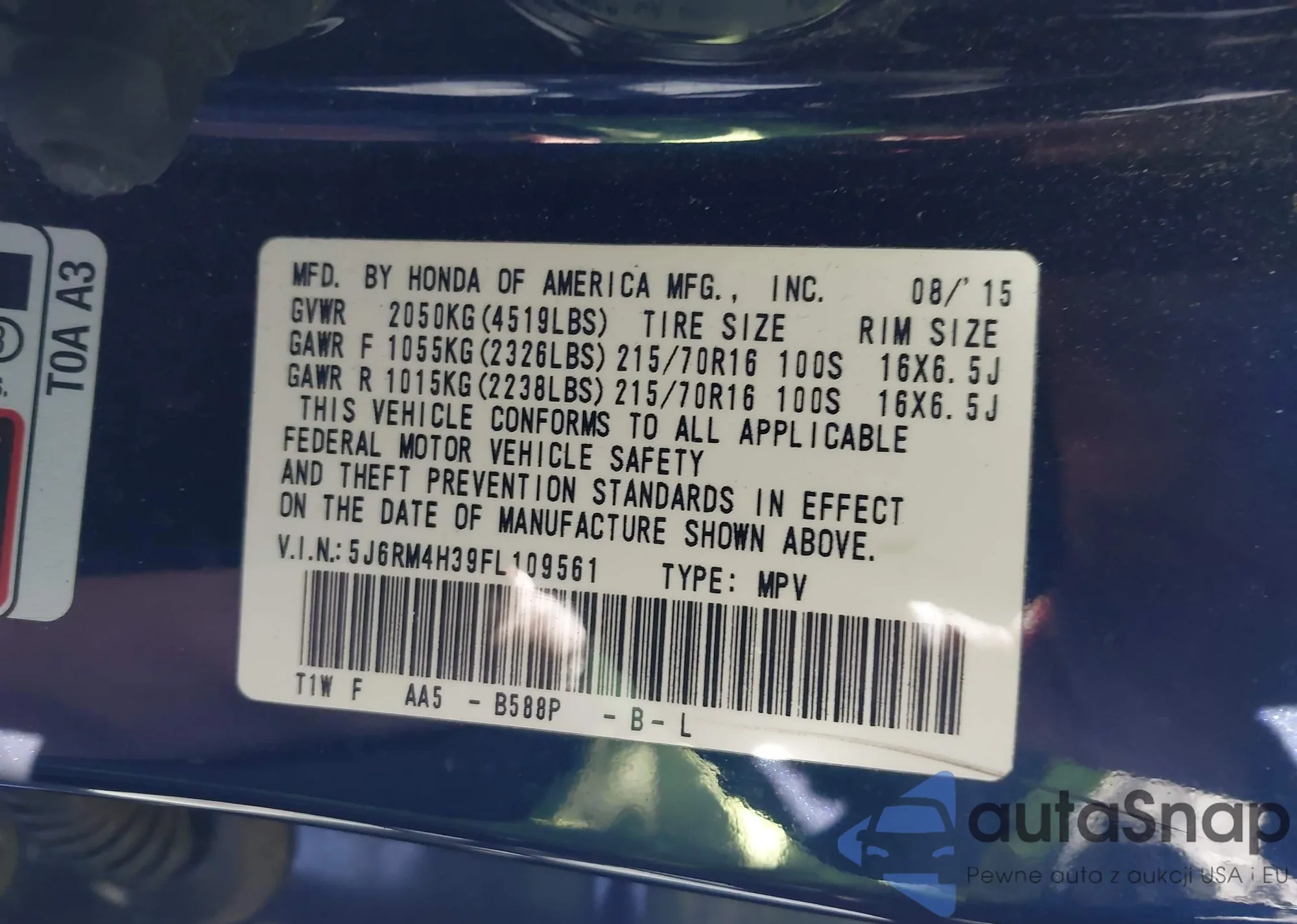• VIN 5J6RM4H39FL109561