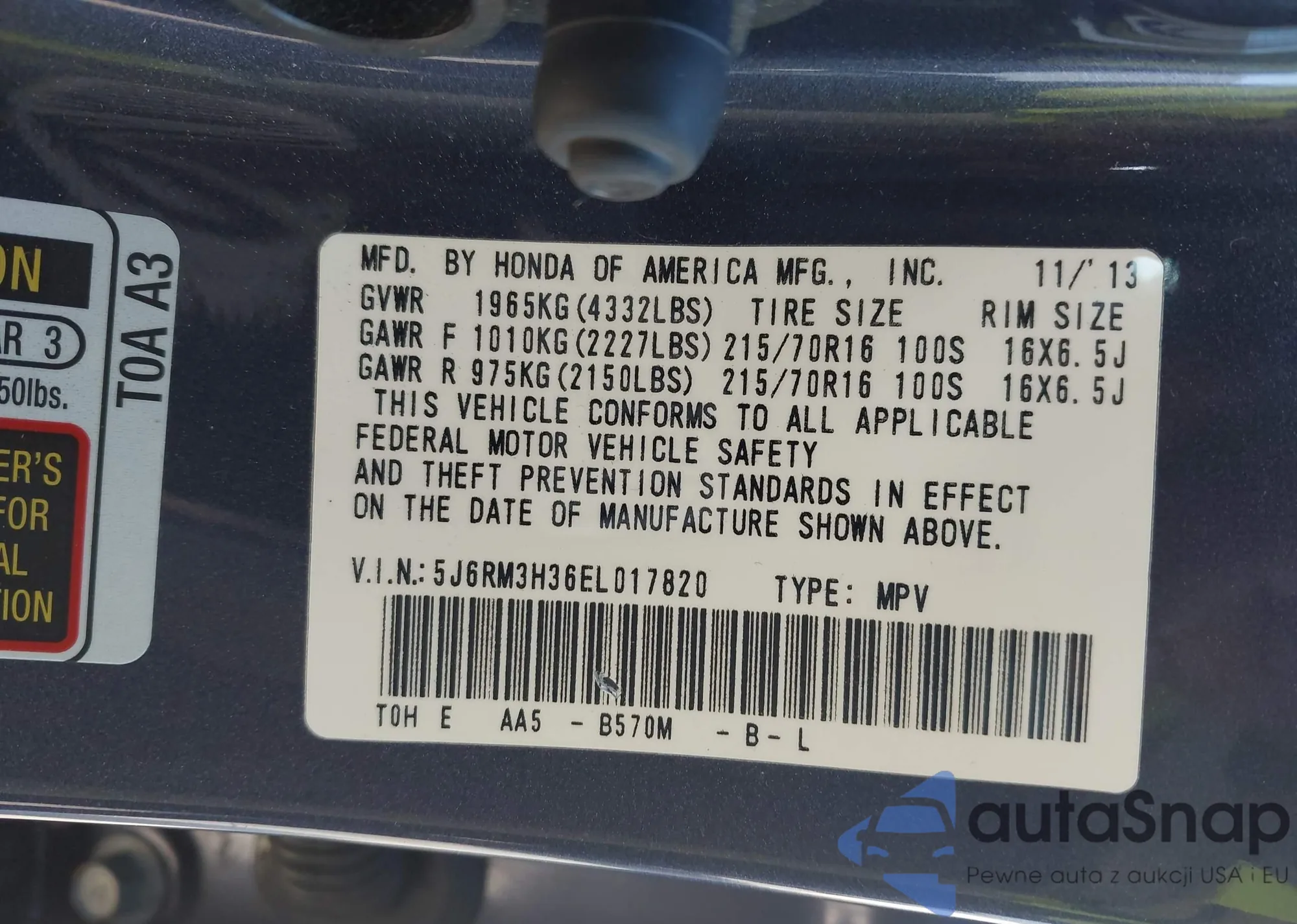 • VIN 5J6RM3H36EL017820
