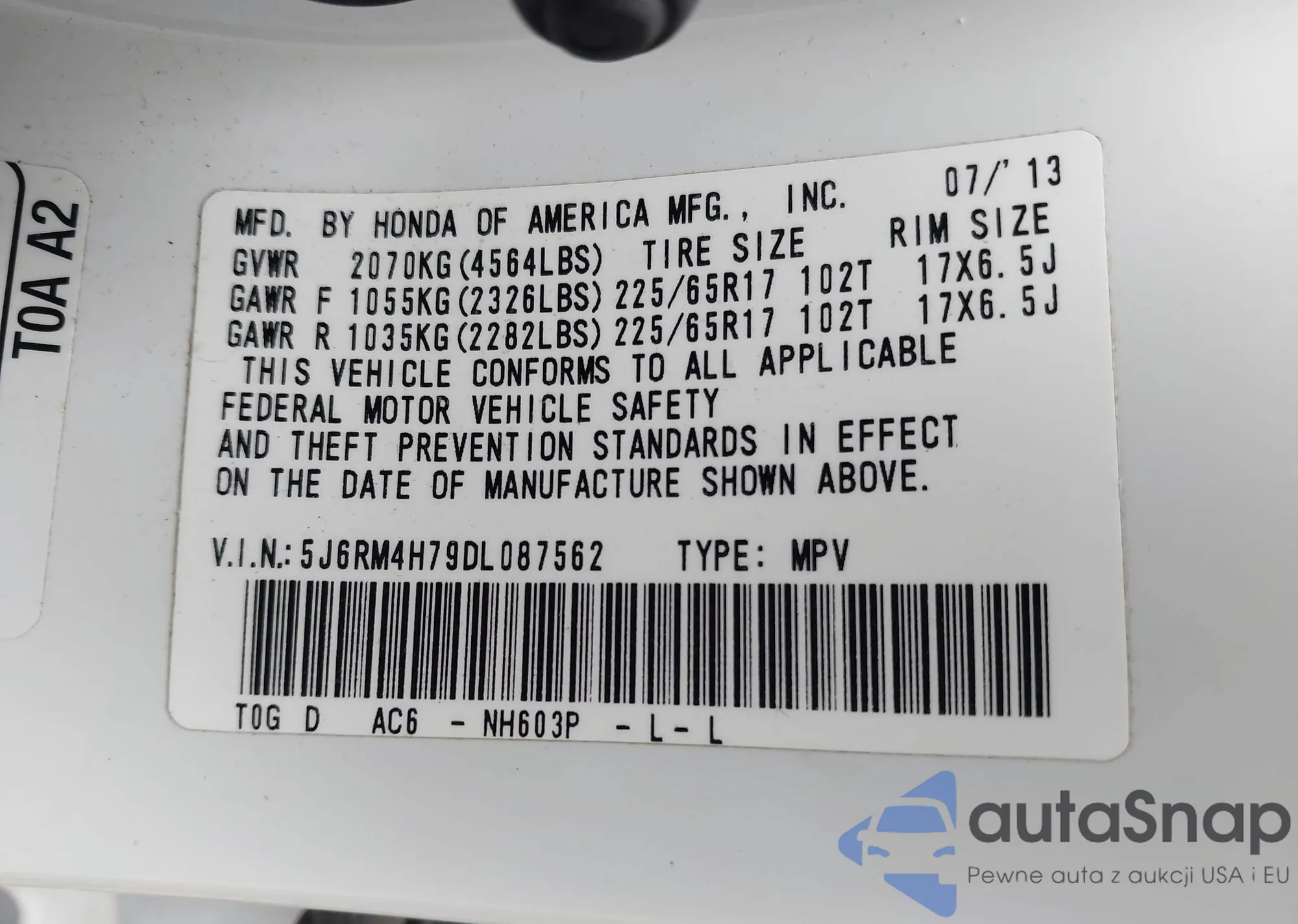 • VIN 5J6RM4H79DL087562