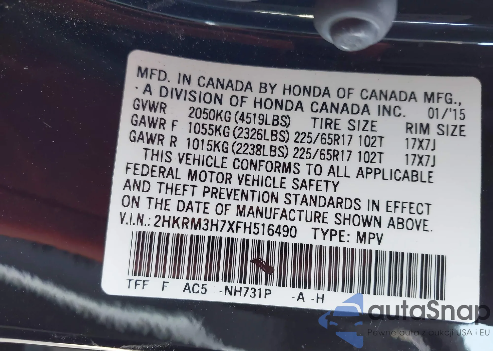• VIN 2HKRM3H7XFH516490