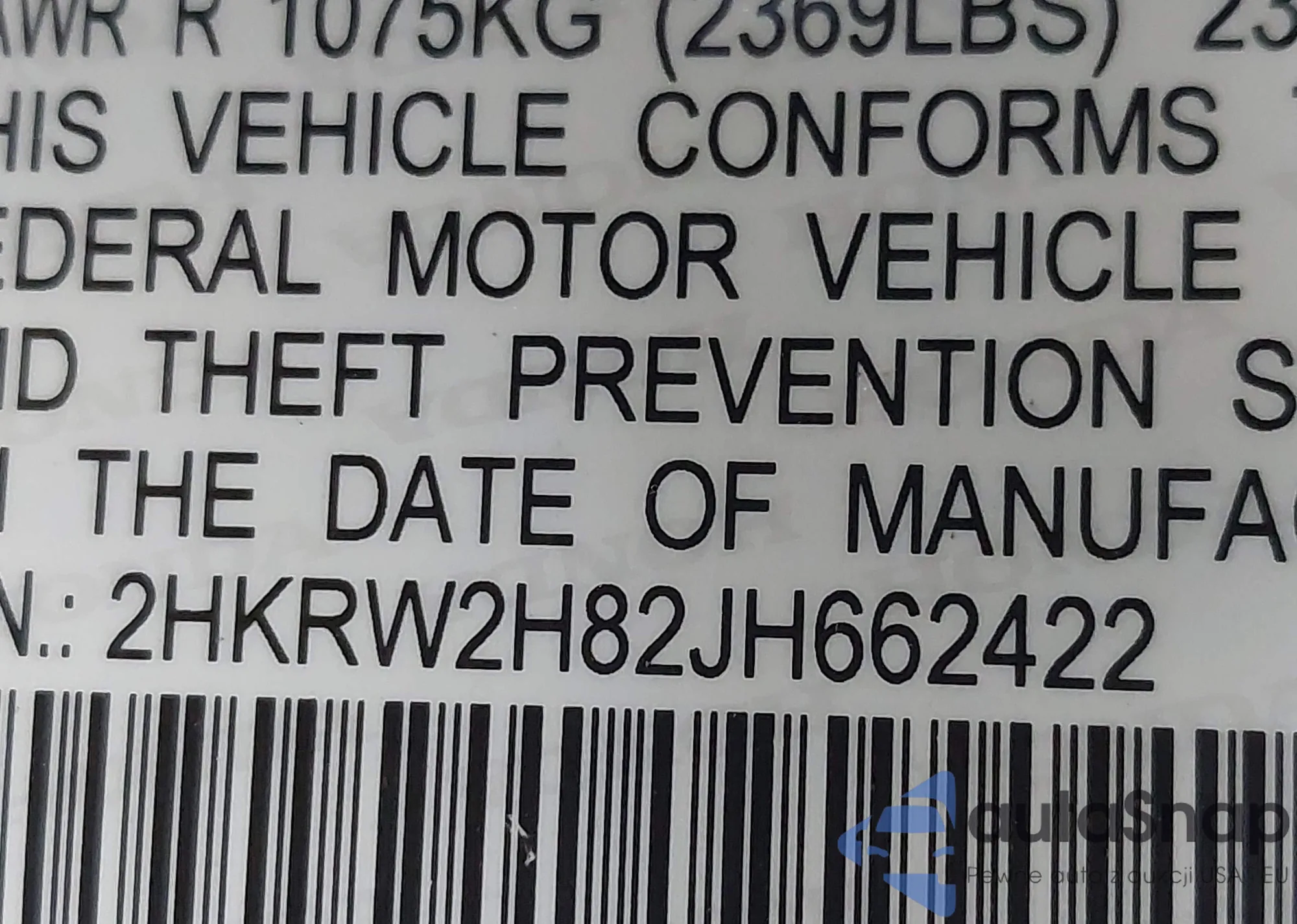 • VIN 2HKRW2H82JH662422