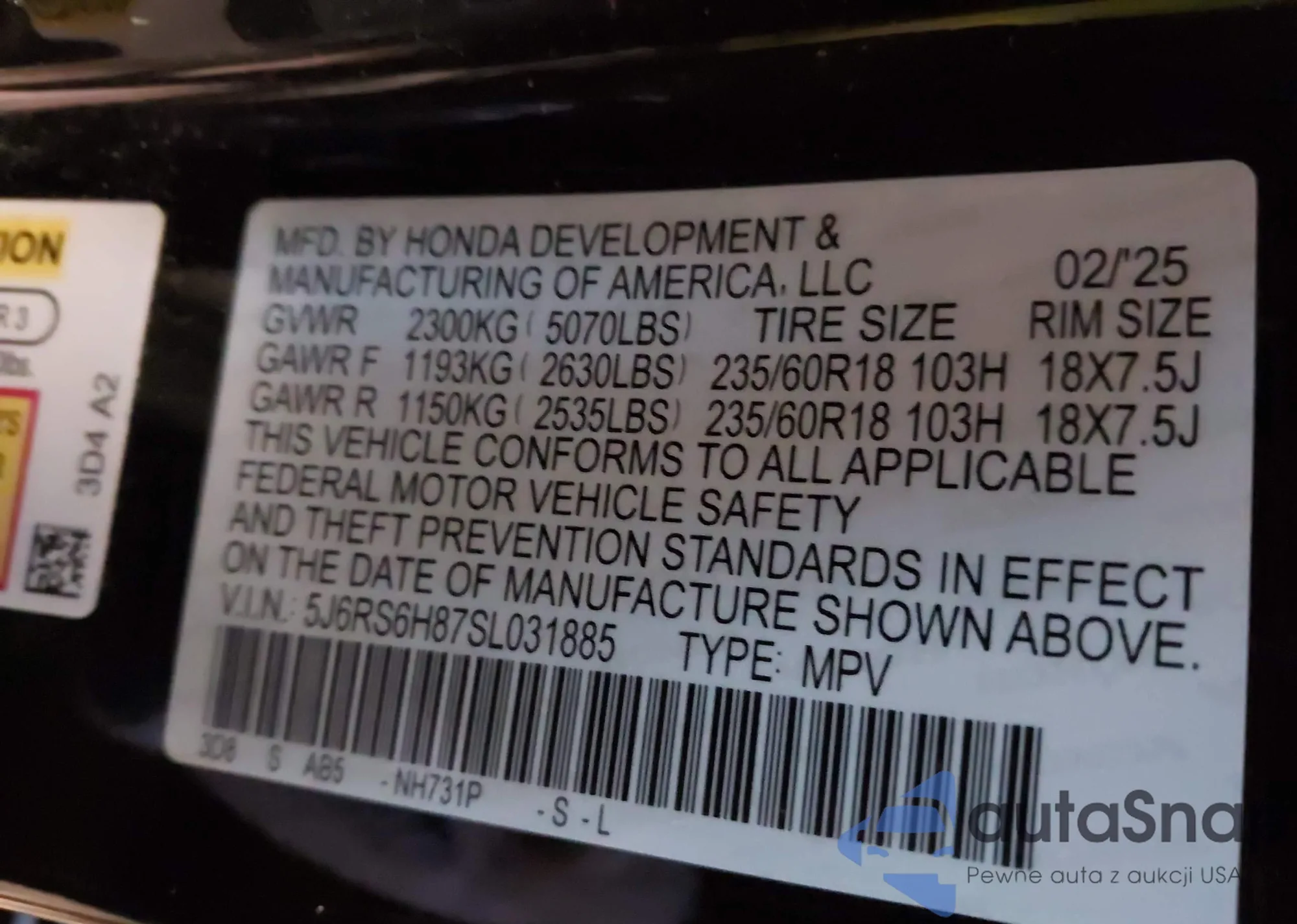 • VIN 5J6RS6H87SL031885