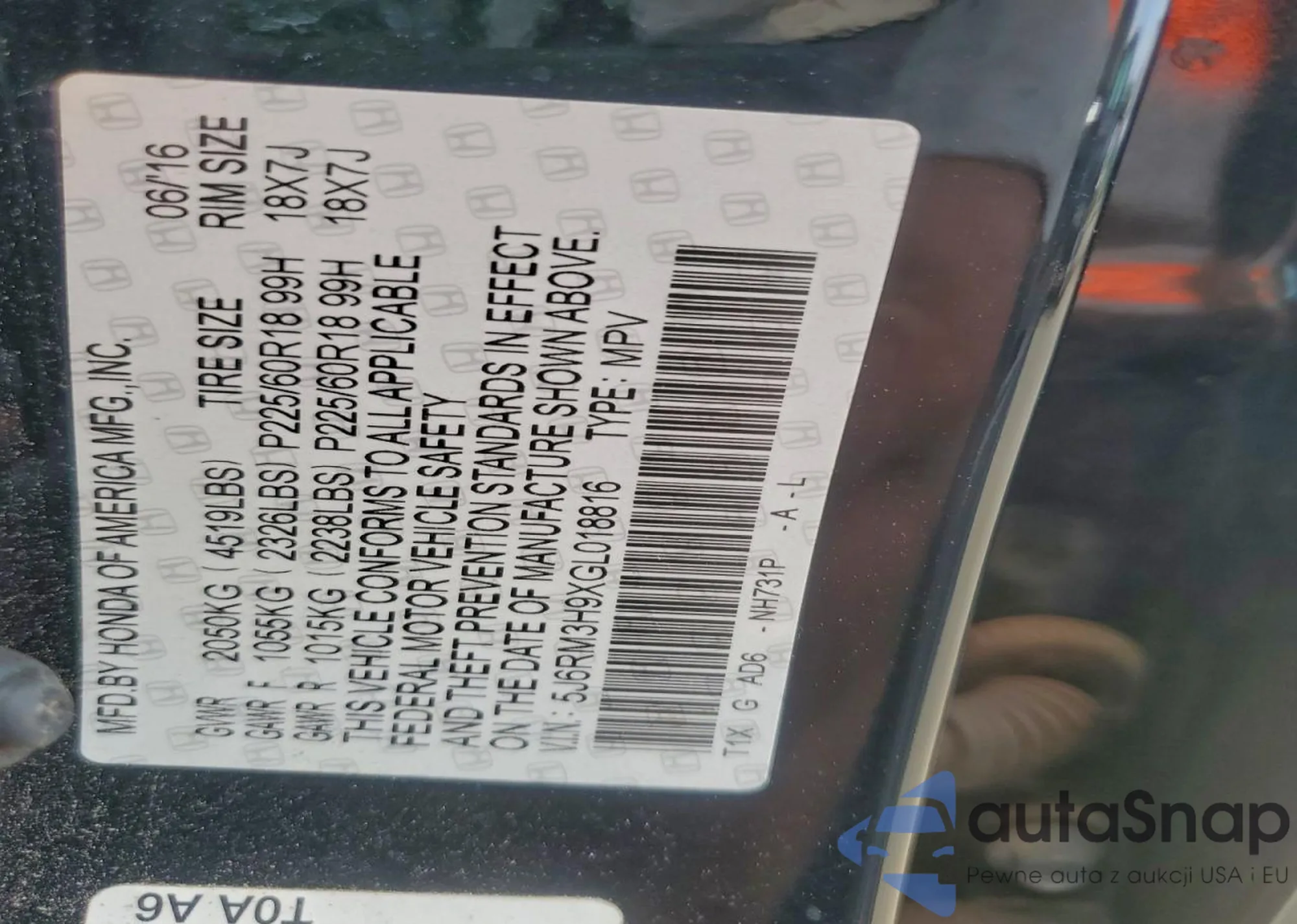 • VIN 5J6RM3H9XGL018816
