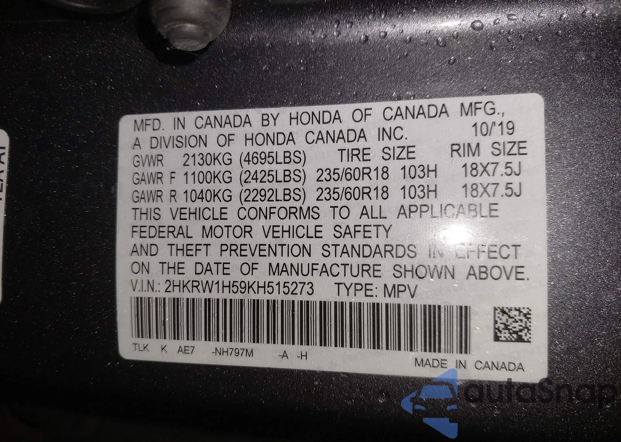 • VIN 2HKRW1H59KH515273