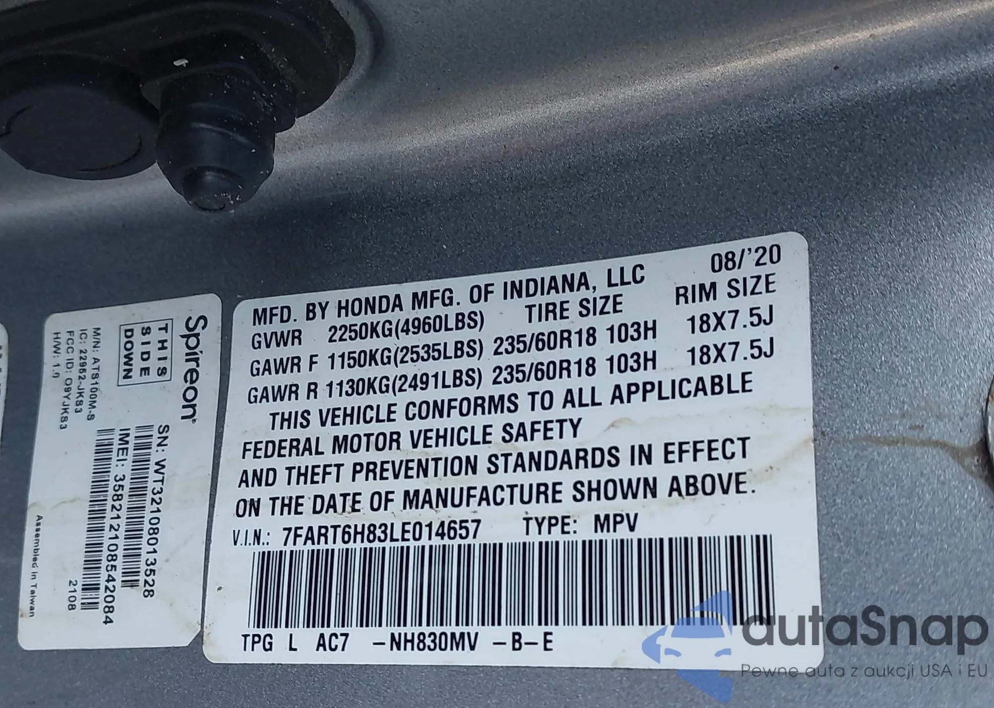 • VIN 5J6RW2H2XLL003721