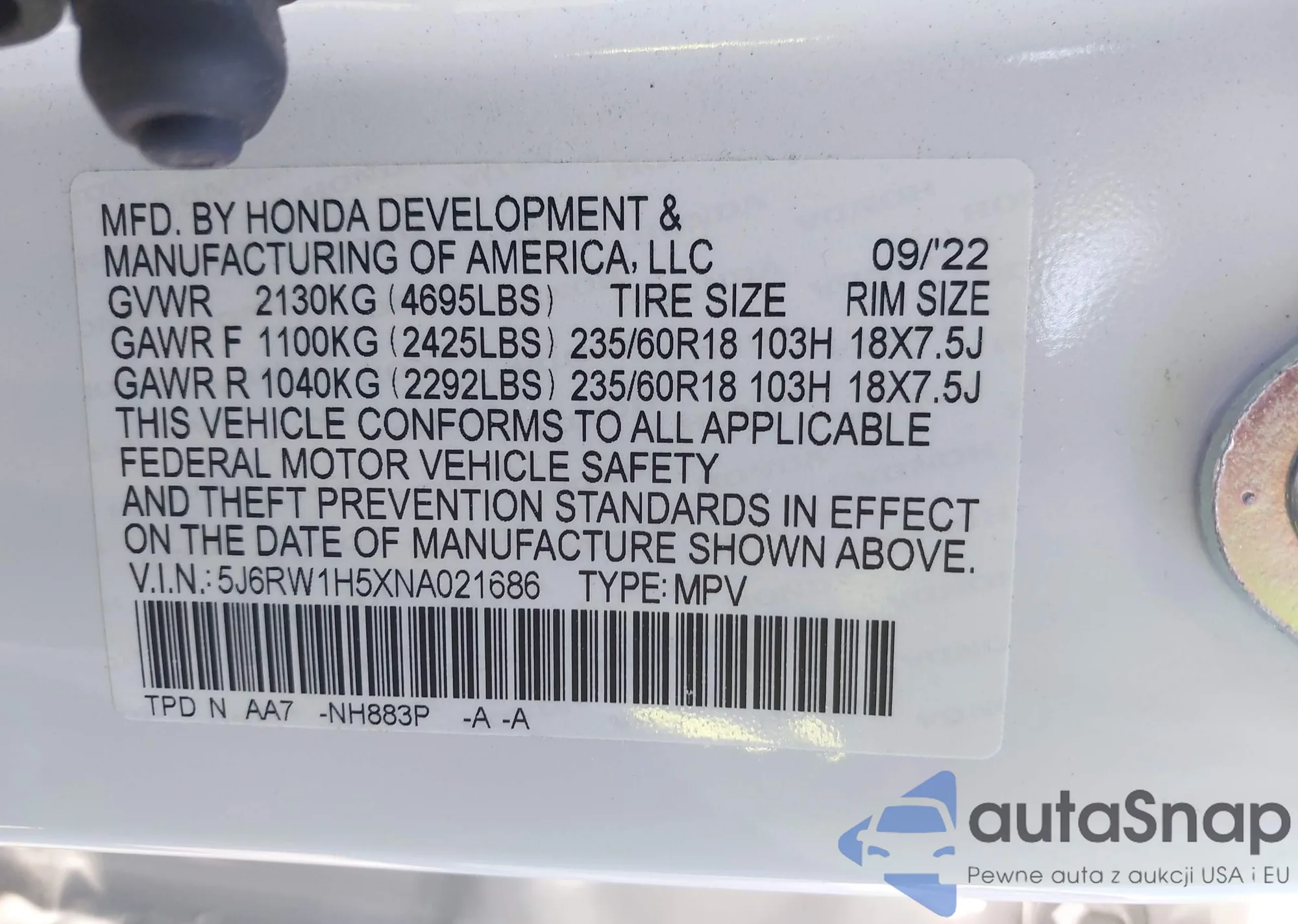 • VIN 5J6RW1H5XNA021686