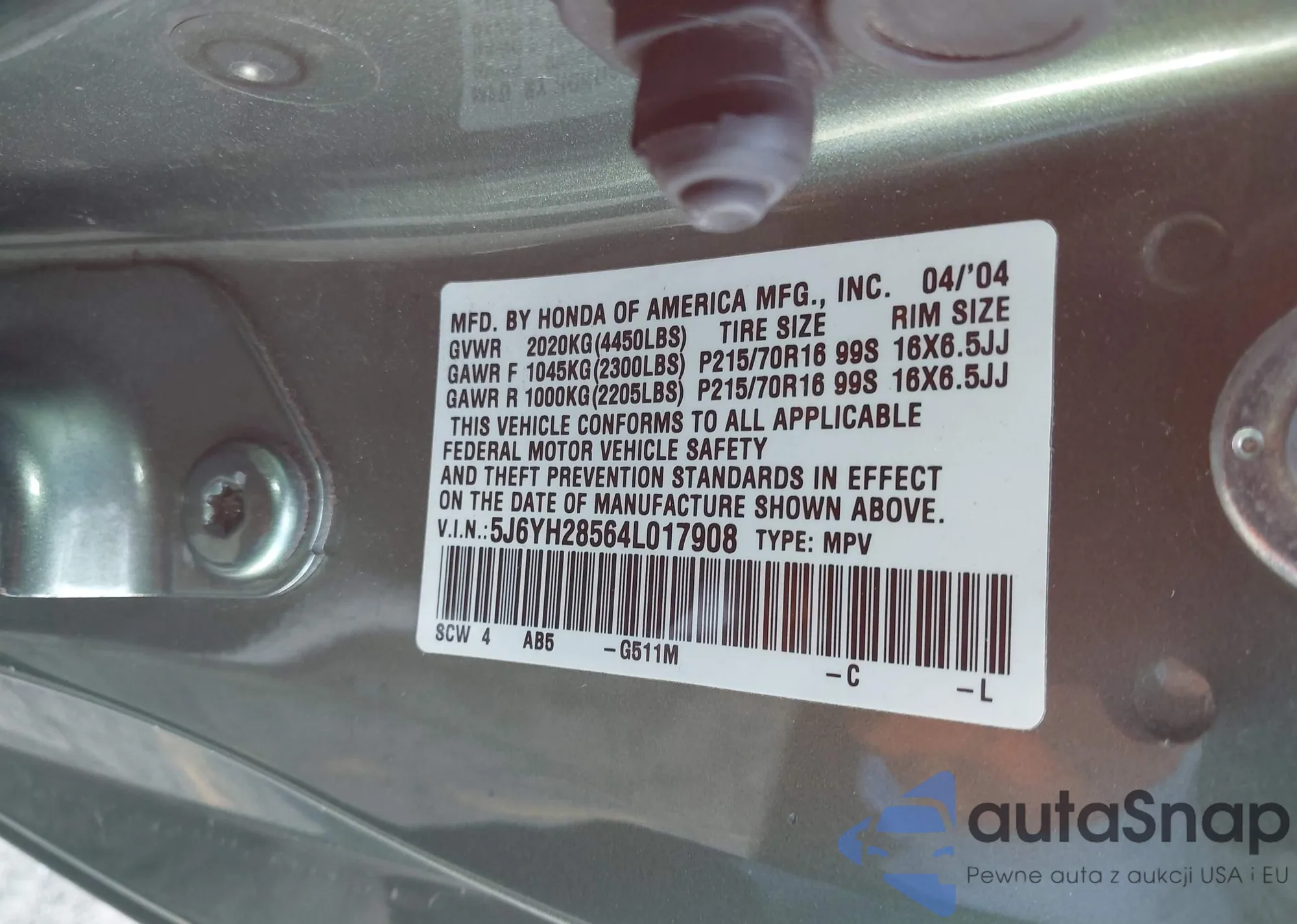 LOT: 43561916 VIN: 5J6YH28674L010362