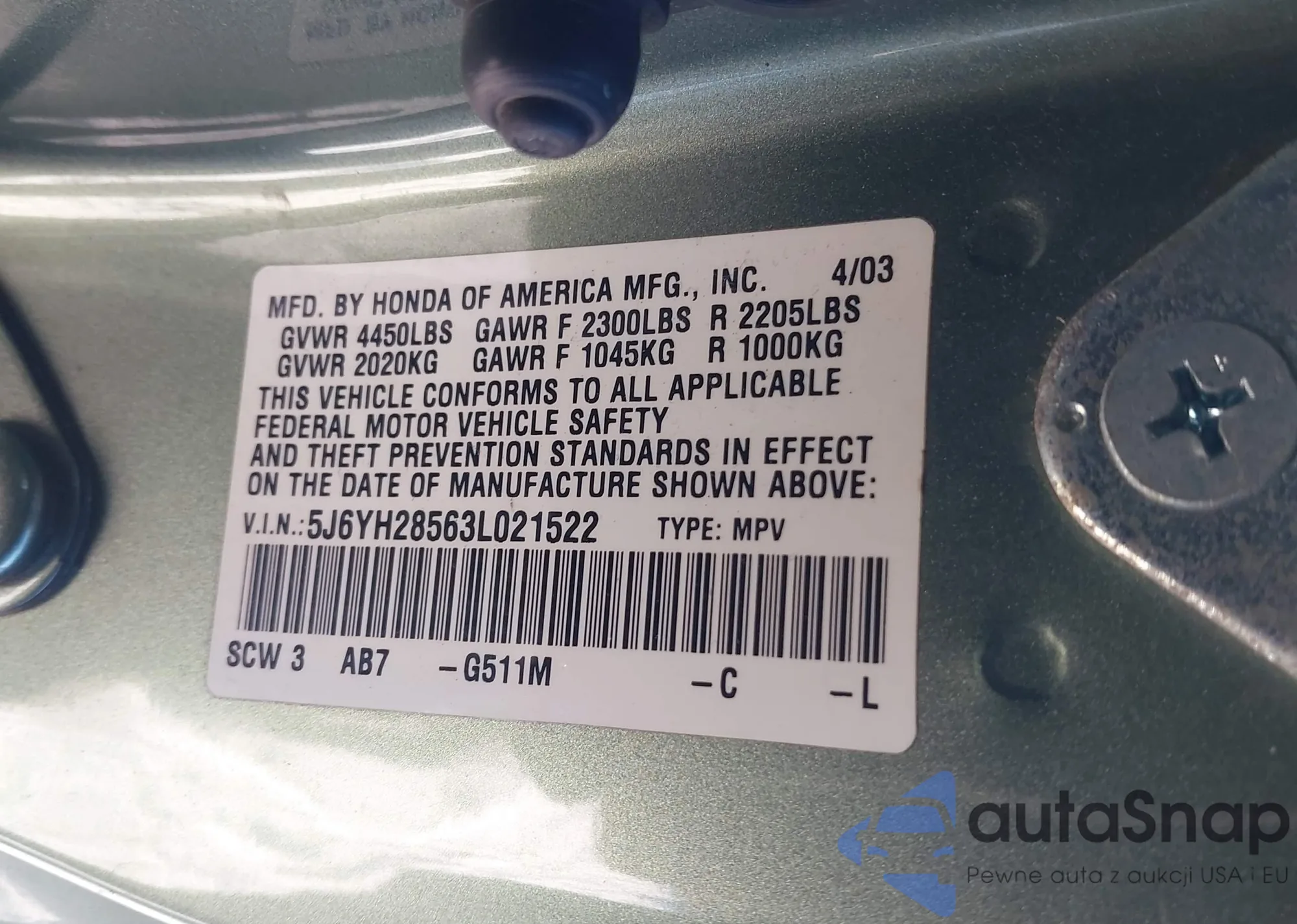 • VIN 5J6YH28563L021522