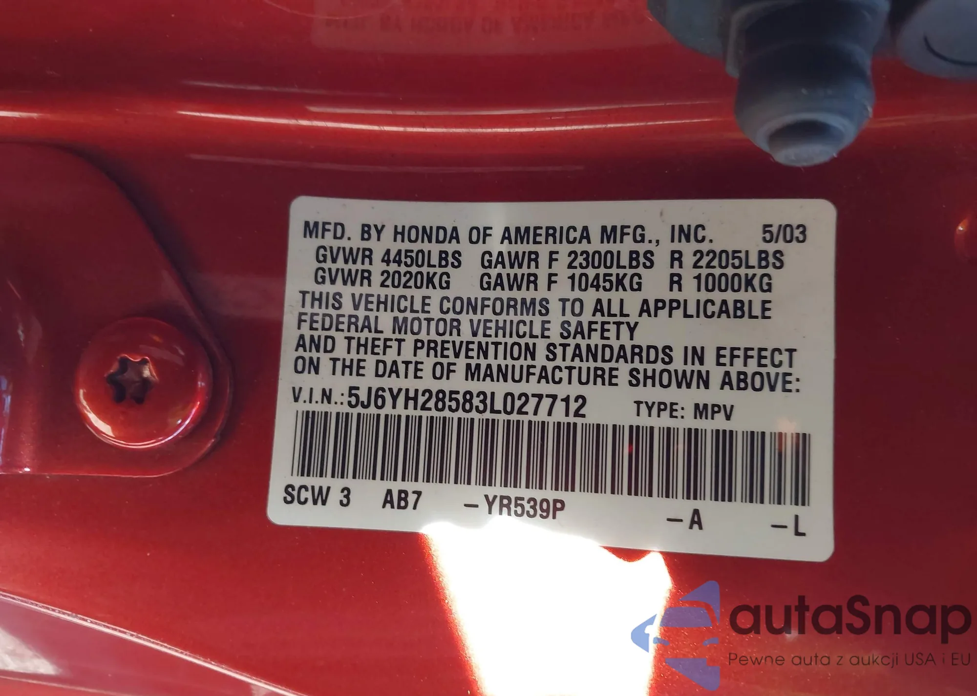 • VIN 5J6YH28583L027712