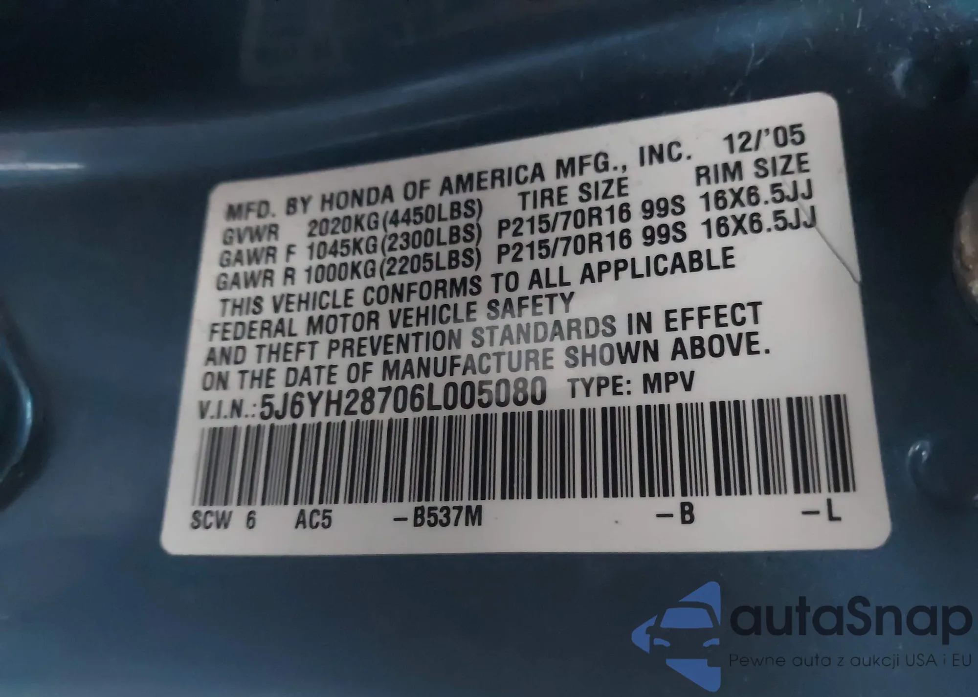 • VIN 5J6YH28706L005080