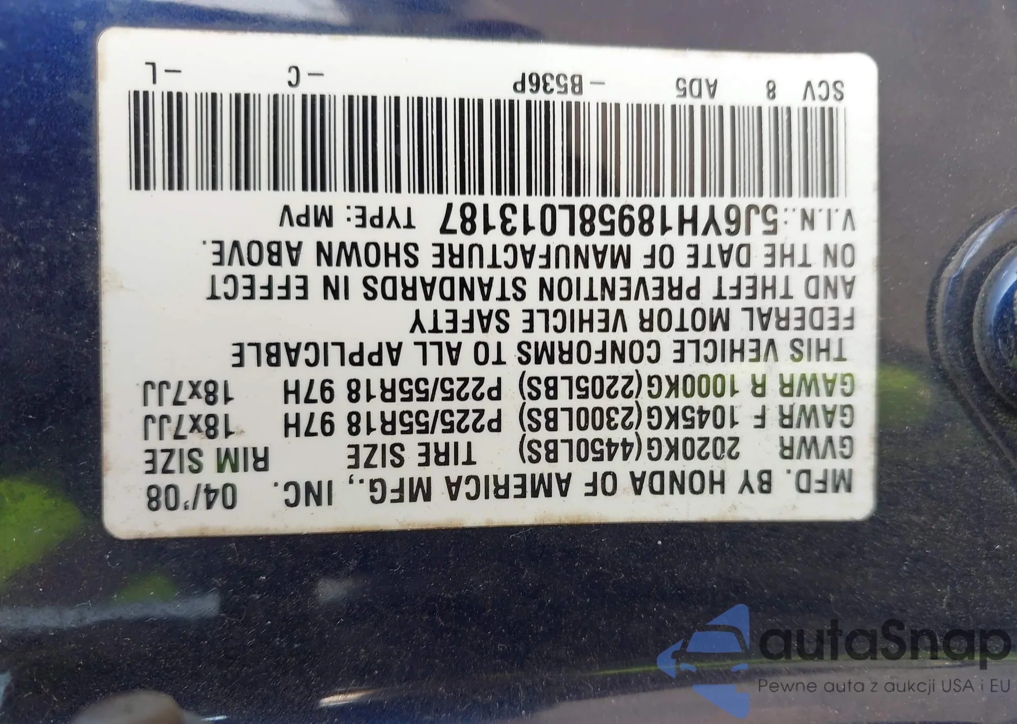 • VIN 5J6YH18958L013187