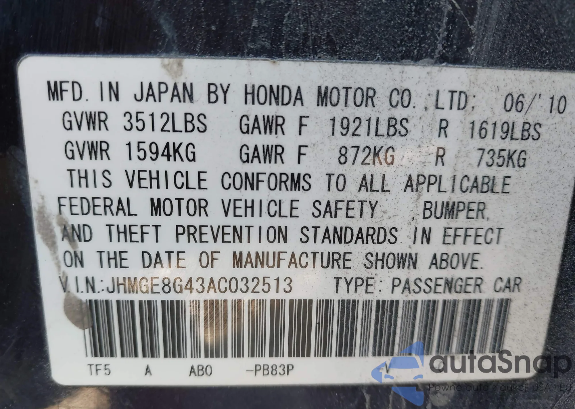 LOT: 43465160 VIN: JHMGE8H43AS000441