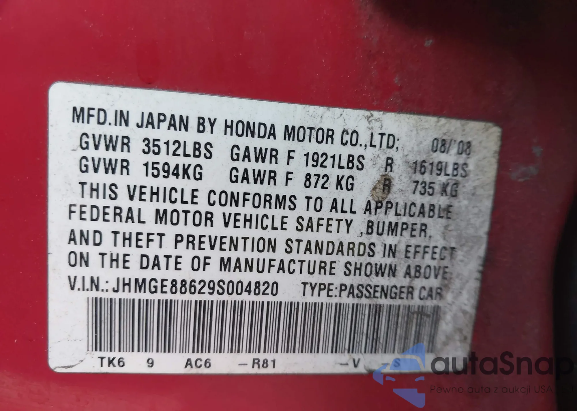 LOT: 43942228 VIN: JHMGE88629S004820