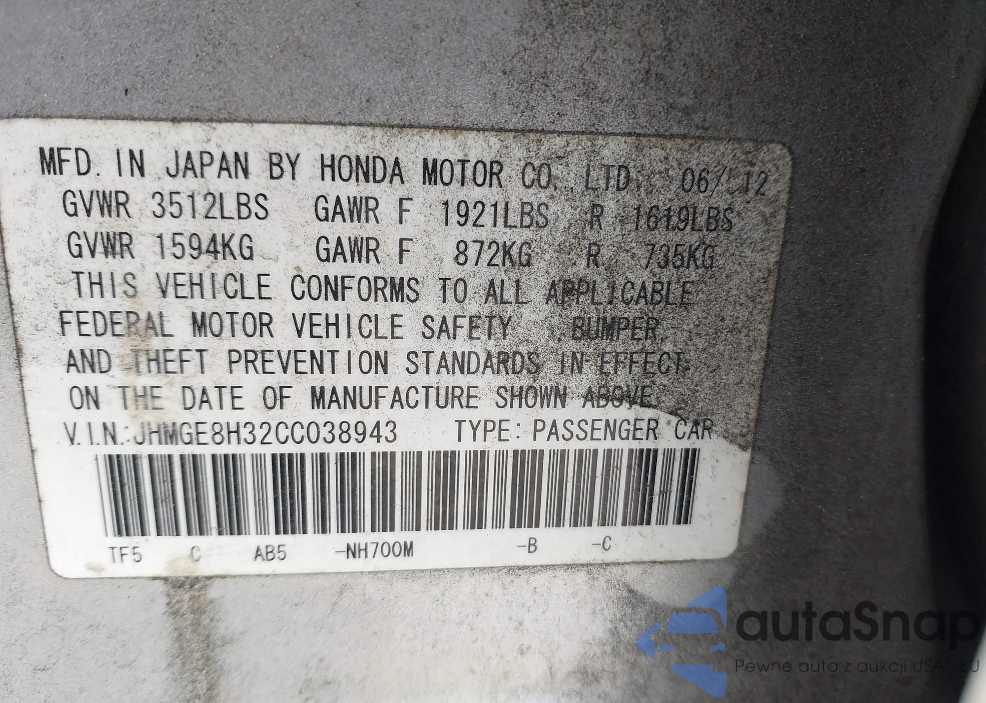 LOT: 44031162 VIN: JHMGE8H68CC042196