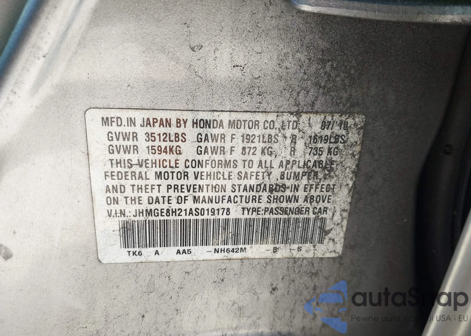 • VIN JHMGE8H21AS019178