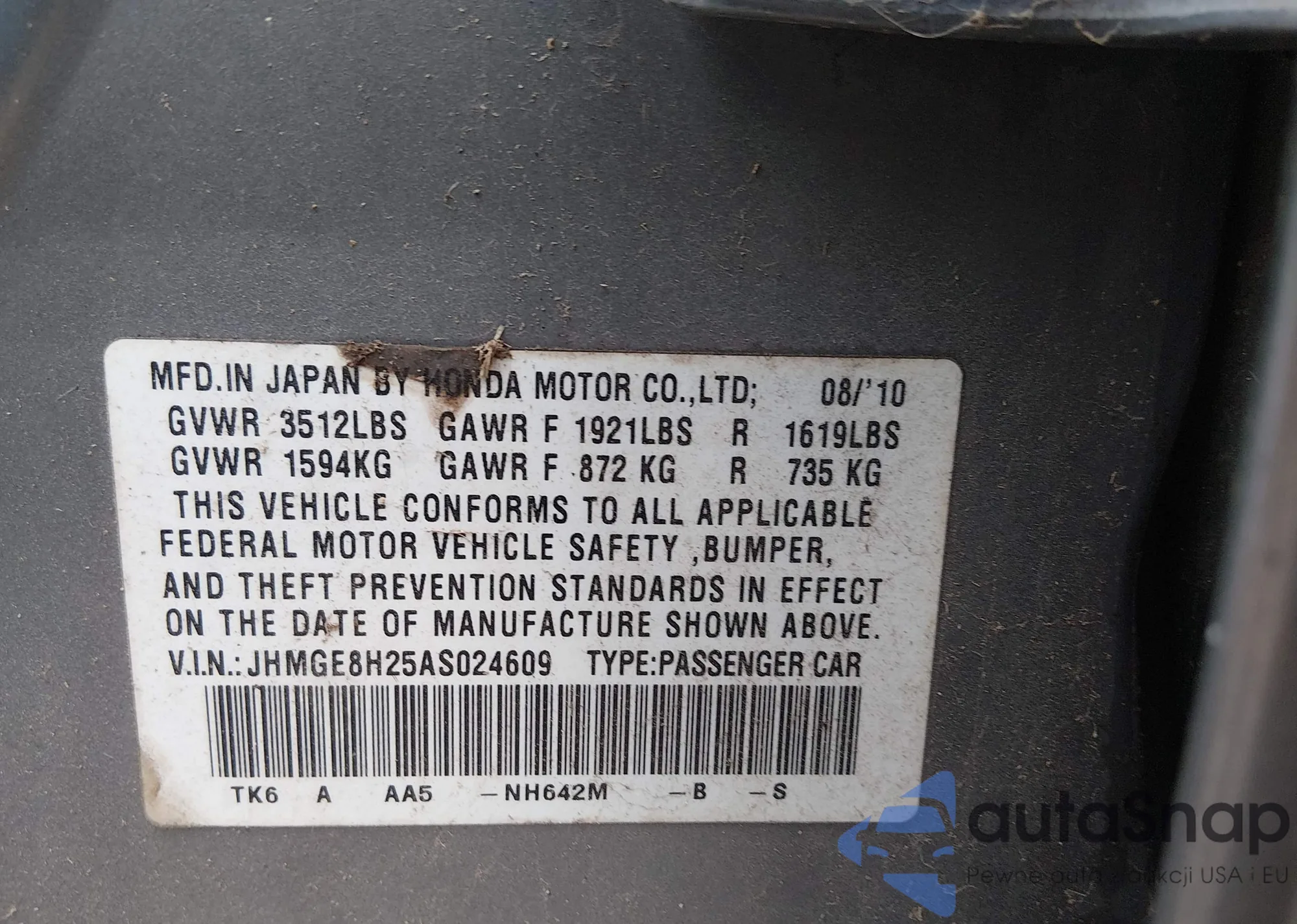 LOT: 44587521 VIN: JHMGE8H25AS024609