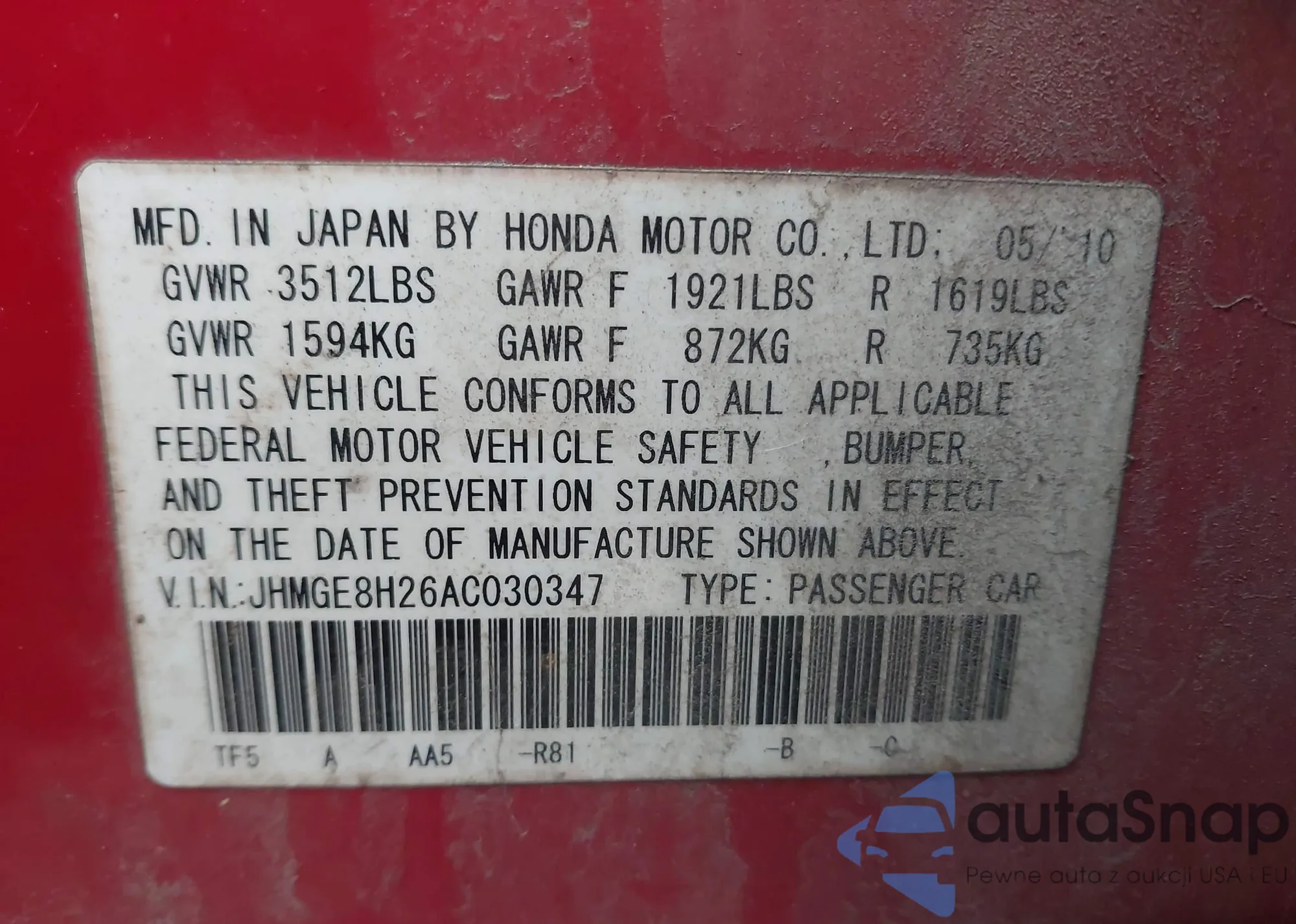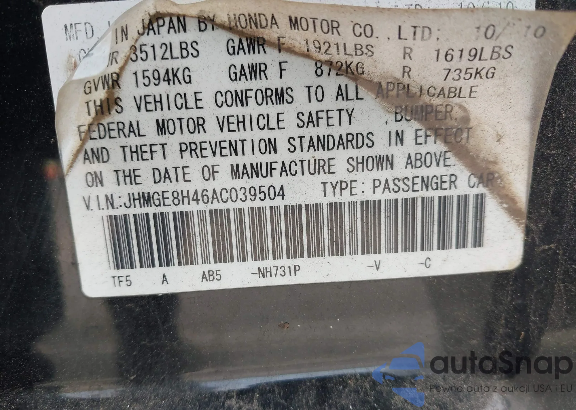 • VIN JHMGE8H46AC039504
