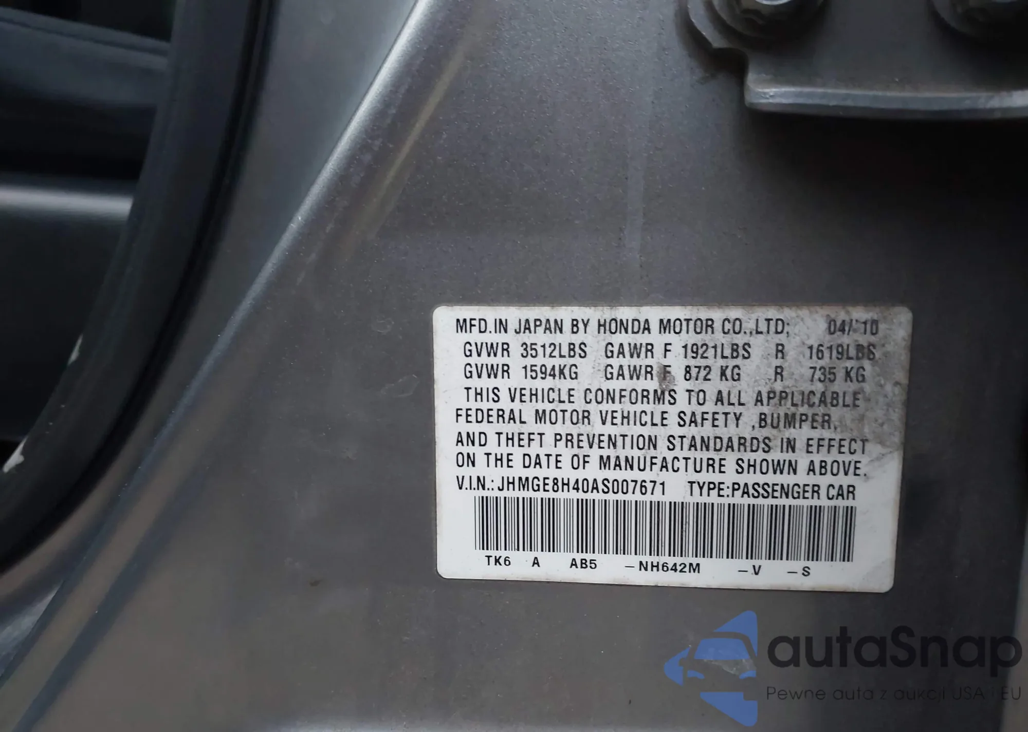 • VIN JHMGE8H40AS007671