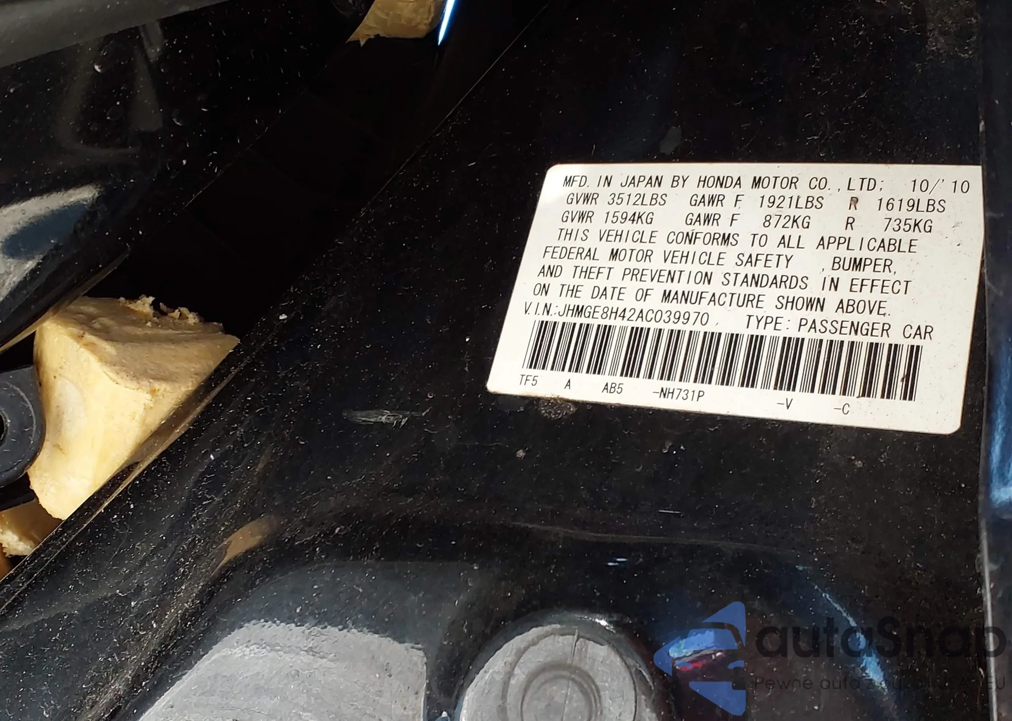 LOT: 43940253 VIN: JHMGE8H40AS007671