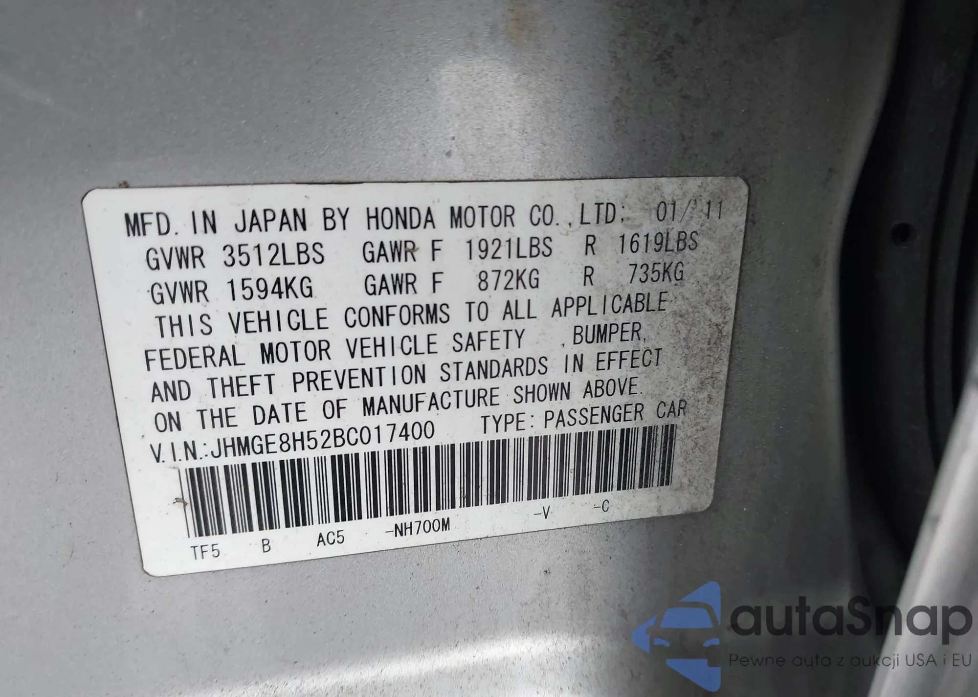 LOT: 44135476 VIN: JHMGE8H52BC017400
