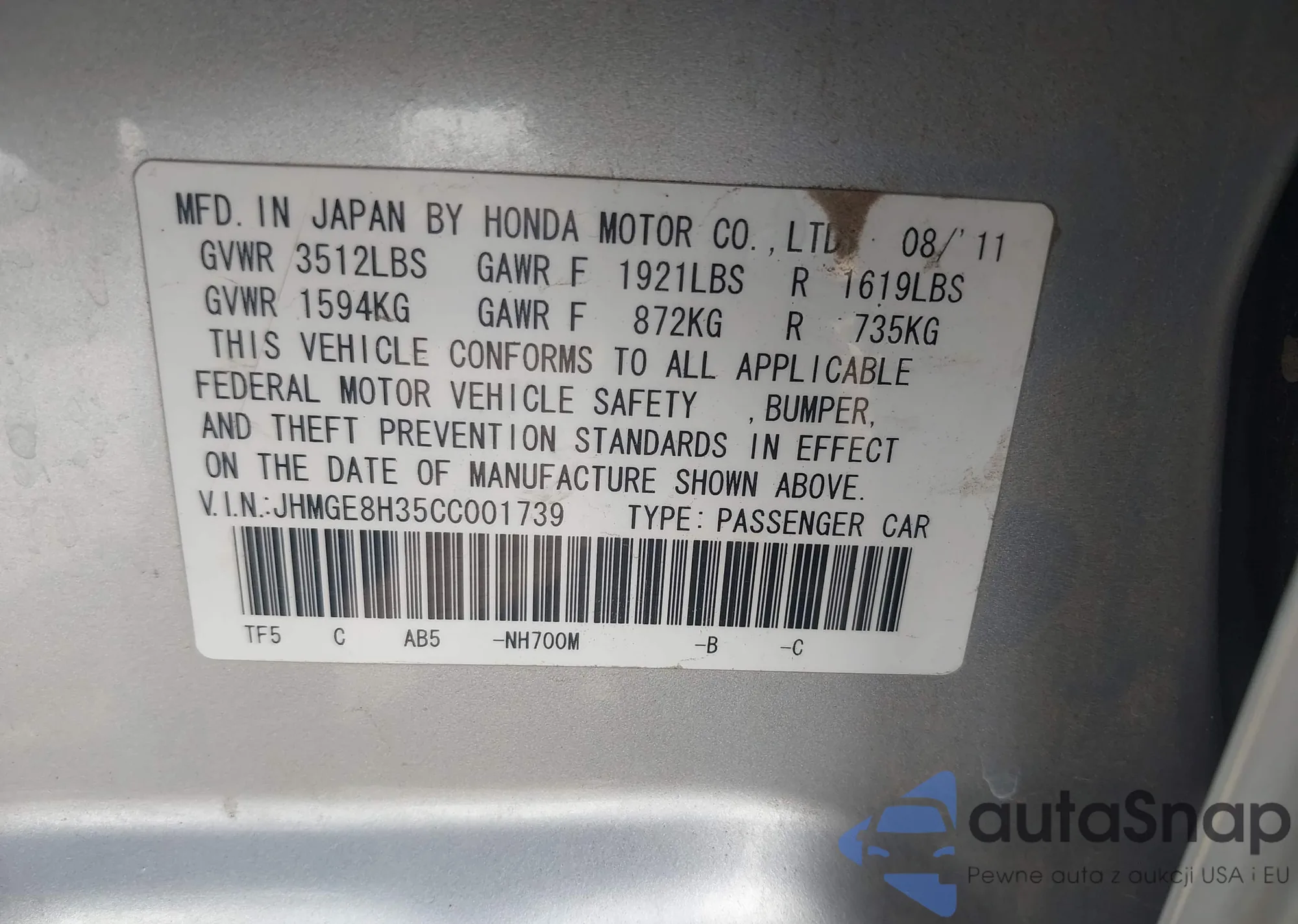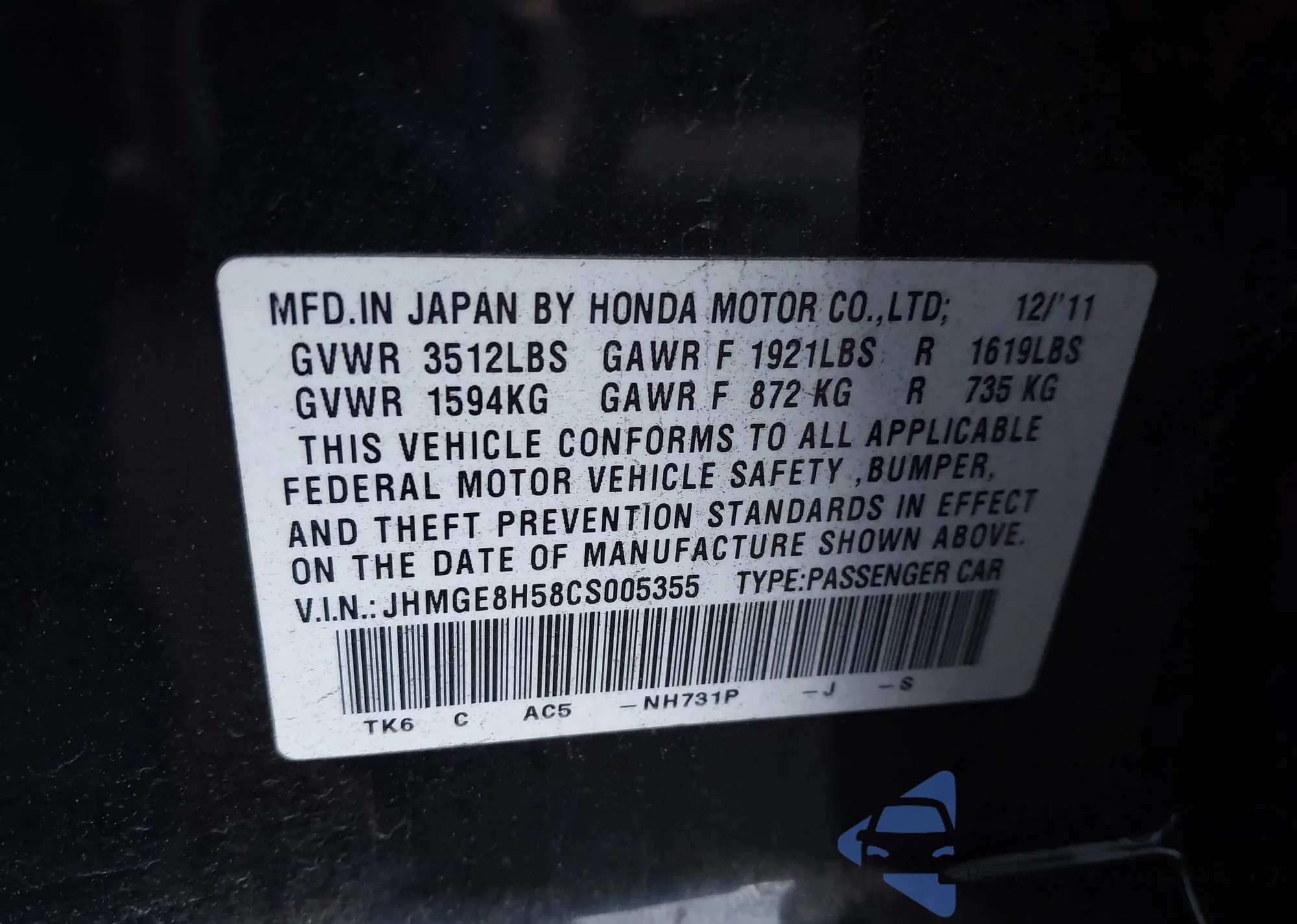 • VIN JHMGE8H35CC001739