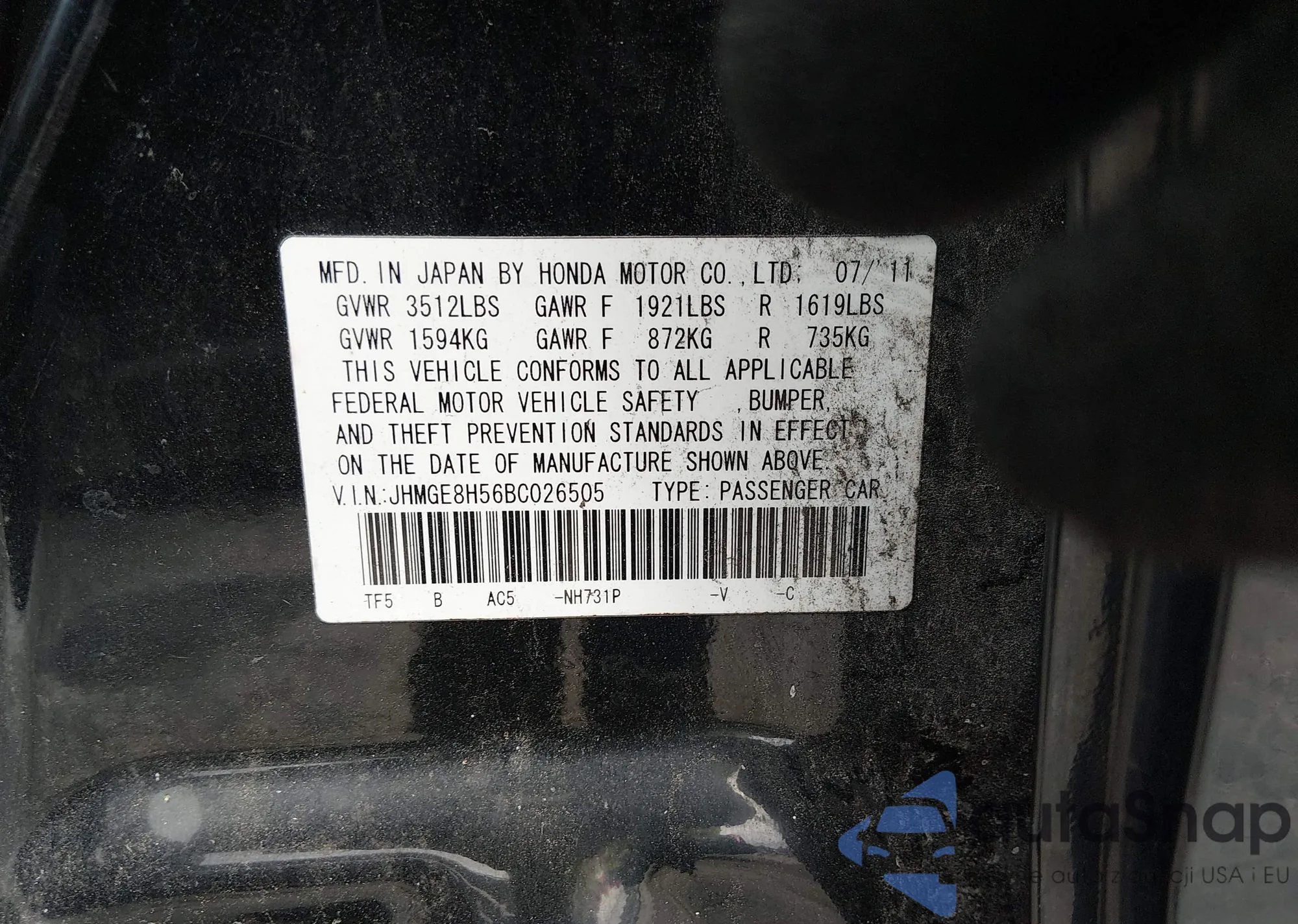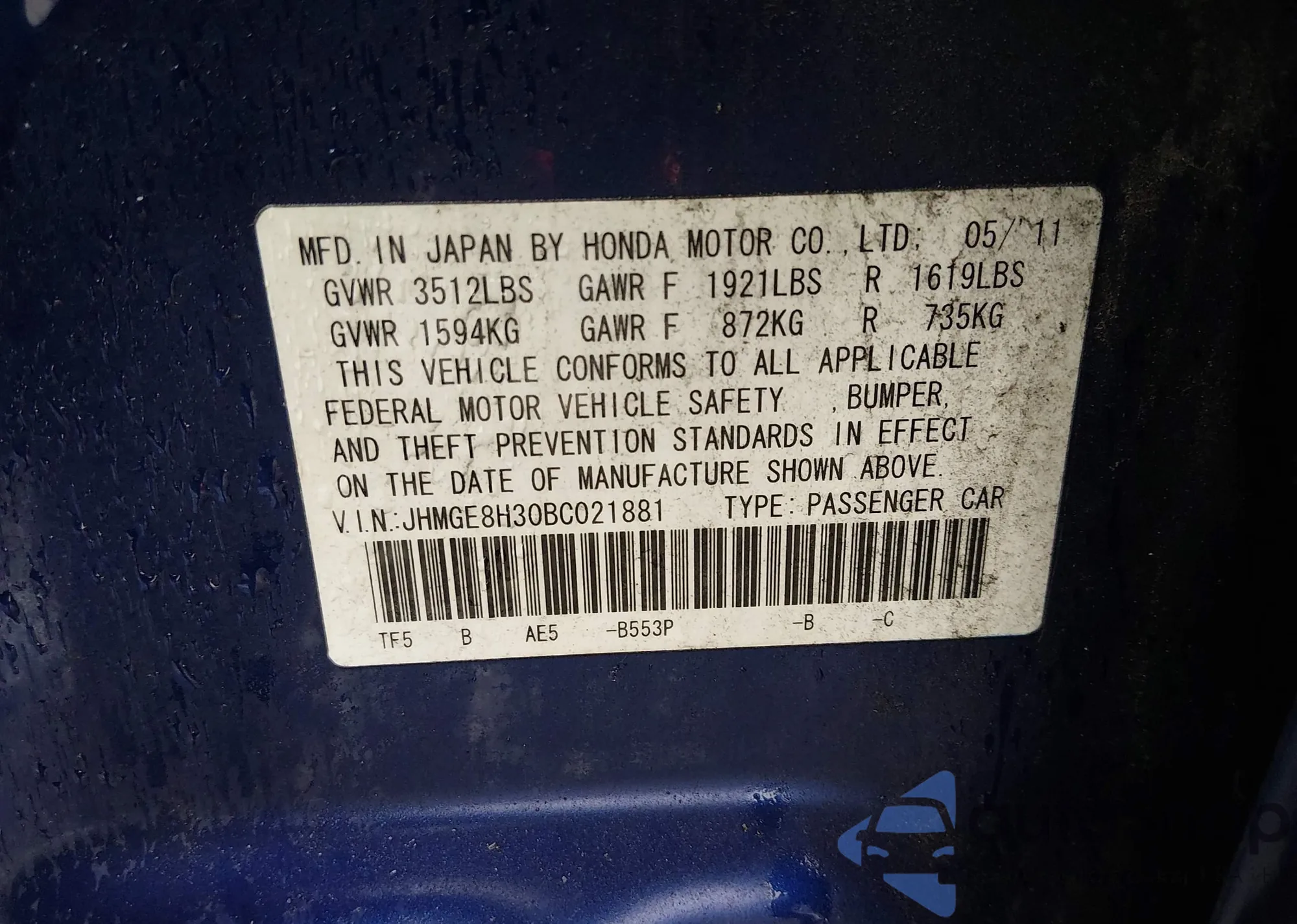 • VIN JHMGE8H30BC021881