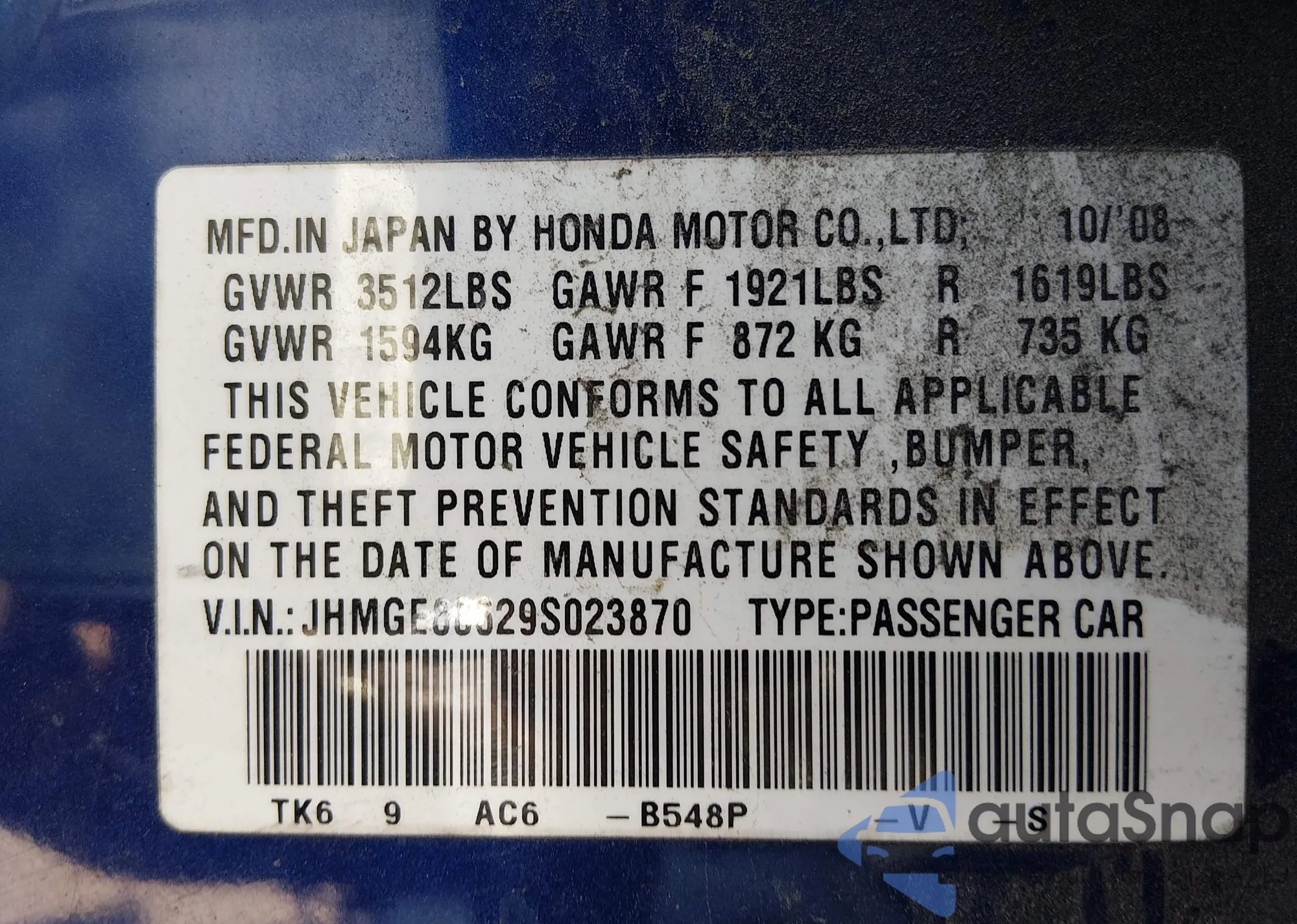 LOT: 70632933 VIN: JHMGE88629S009600