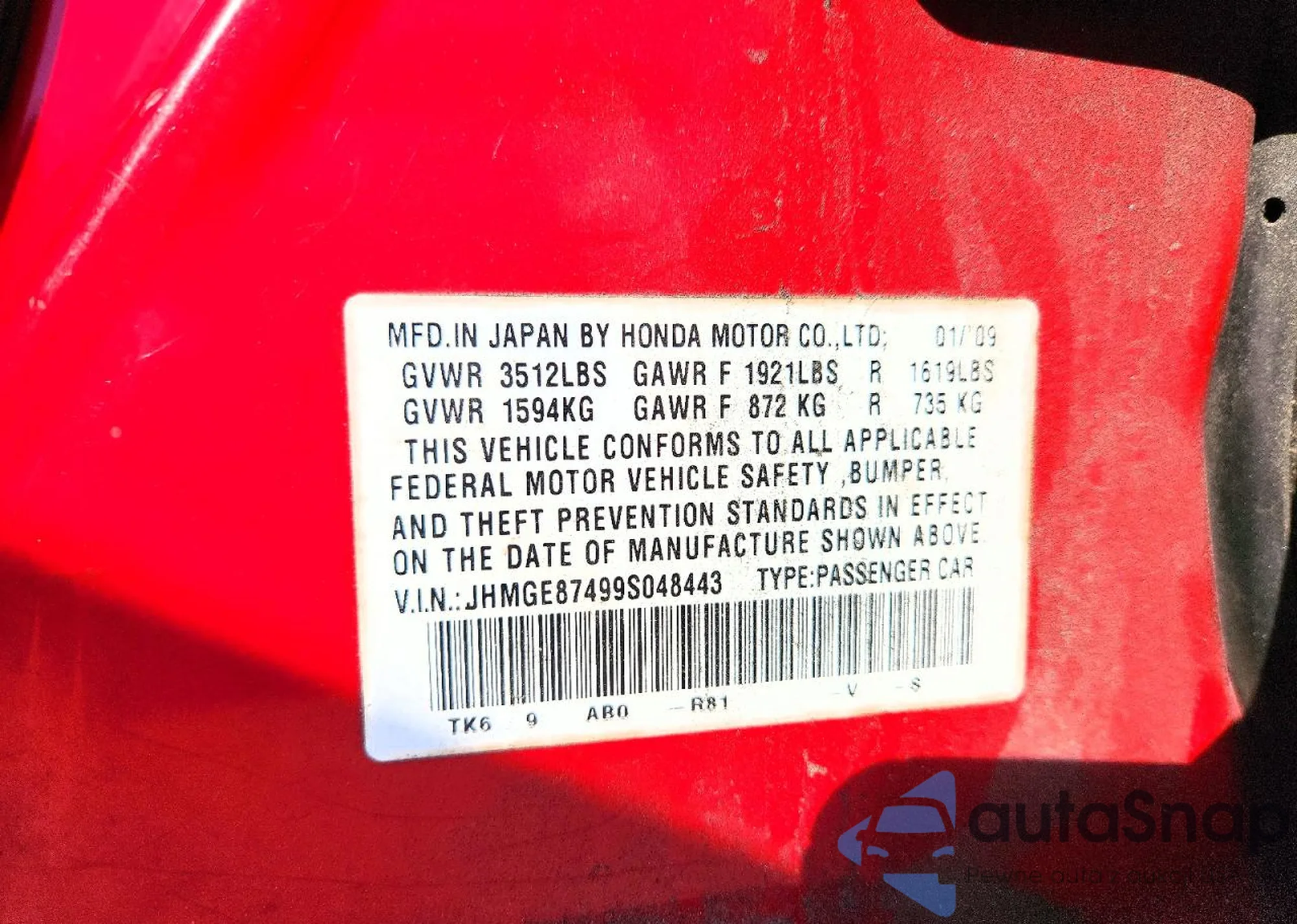 • VIN JHMGE87499S048443