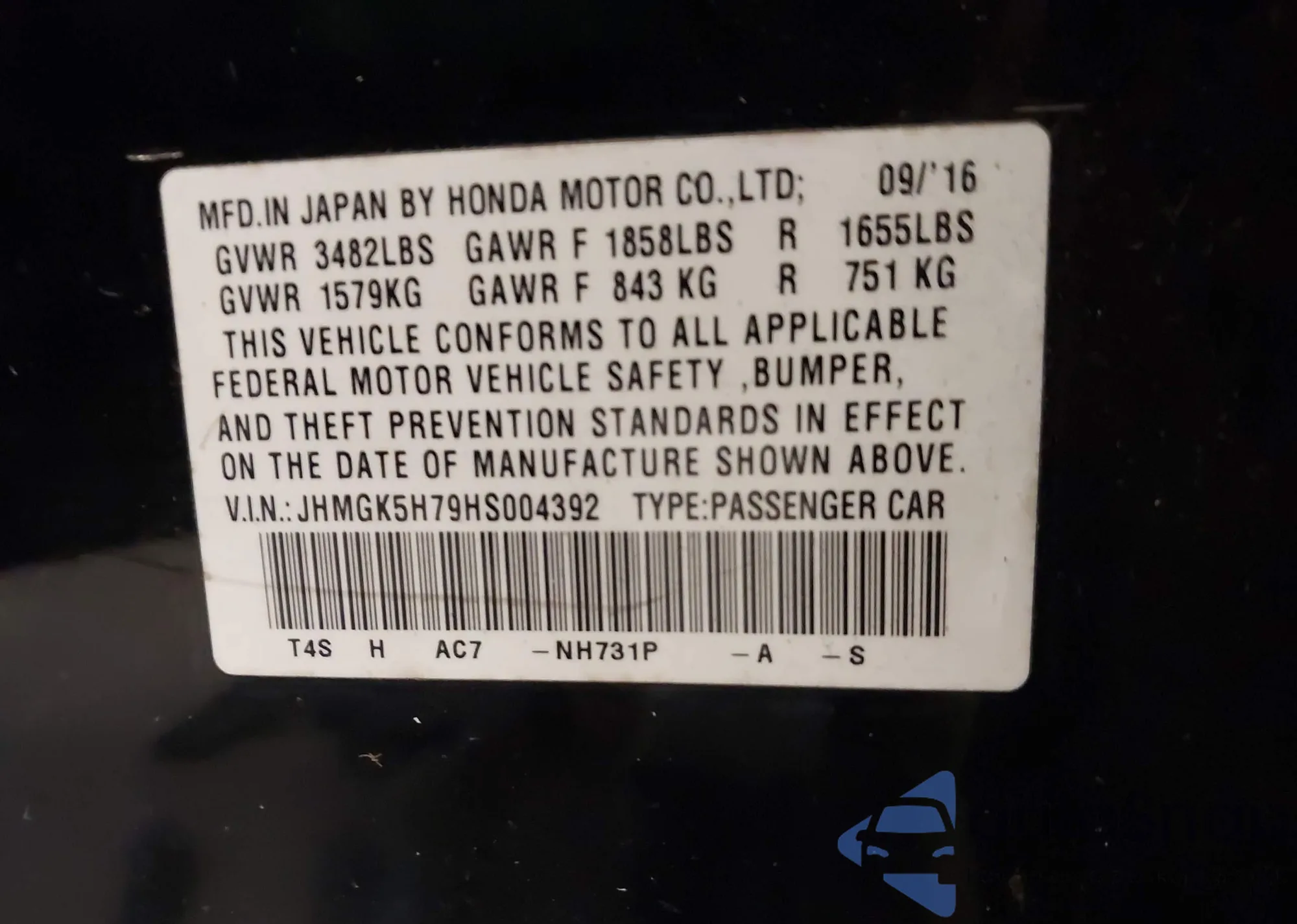 • VIN JHMGK5H79HS004392