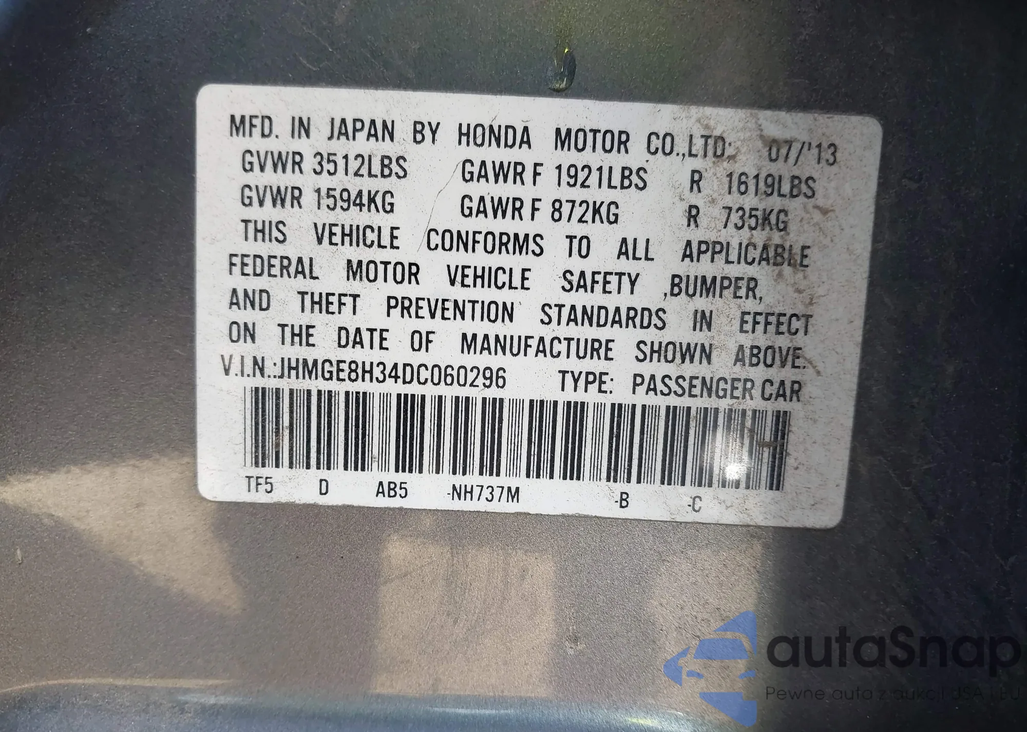LOT: 44132974 VIN: JHMGE8H34DC060296
