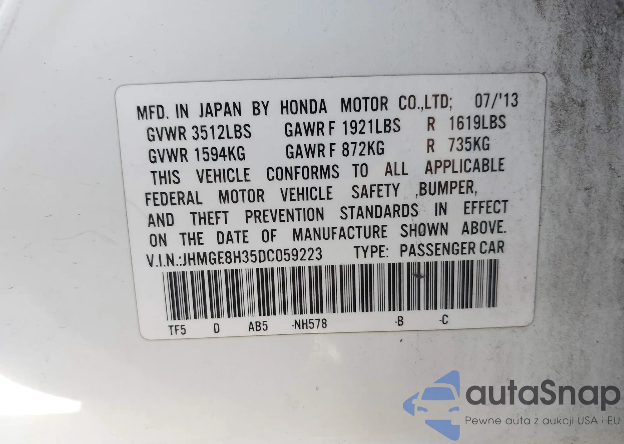 • VIN JHMGE8H35DC059223