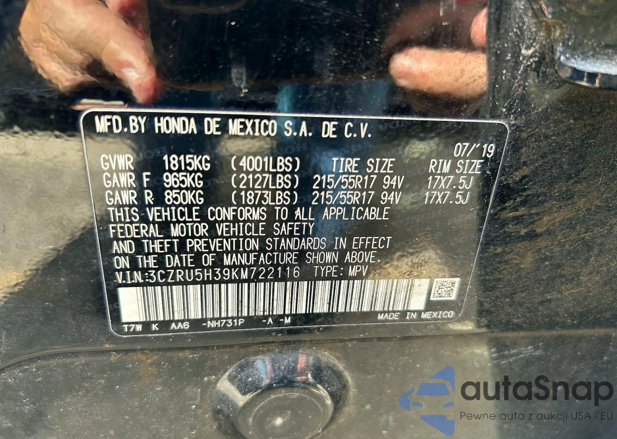 • VIN 3CZRU5H39KM722116