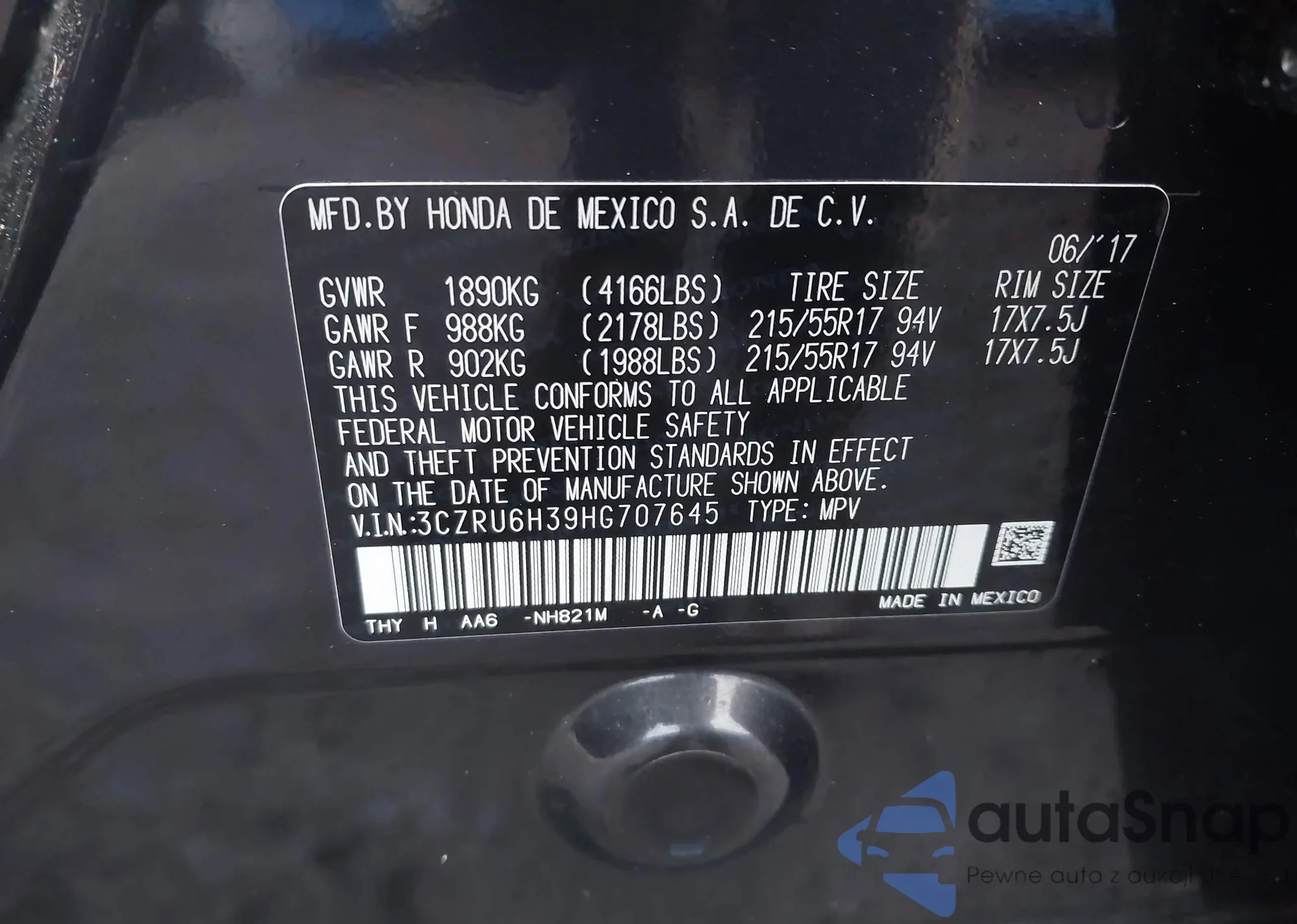 • VIN 3CZRU6H39HG707645