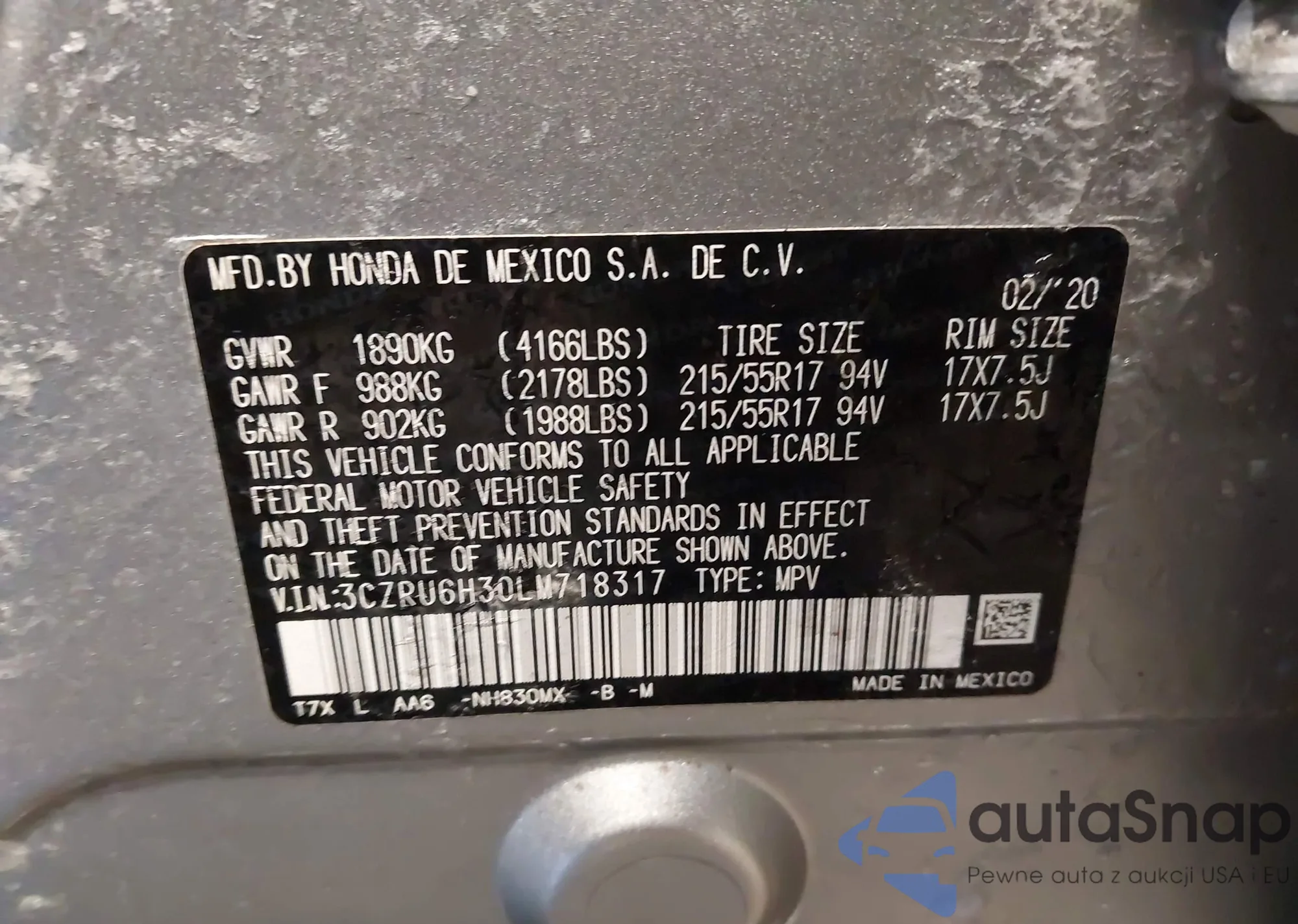 • VIN 3CZRU6H30LM718317
