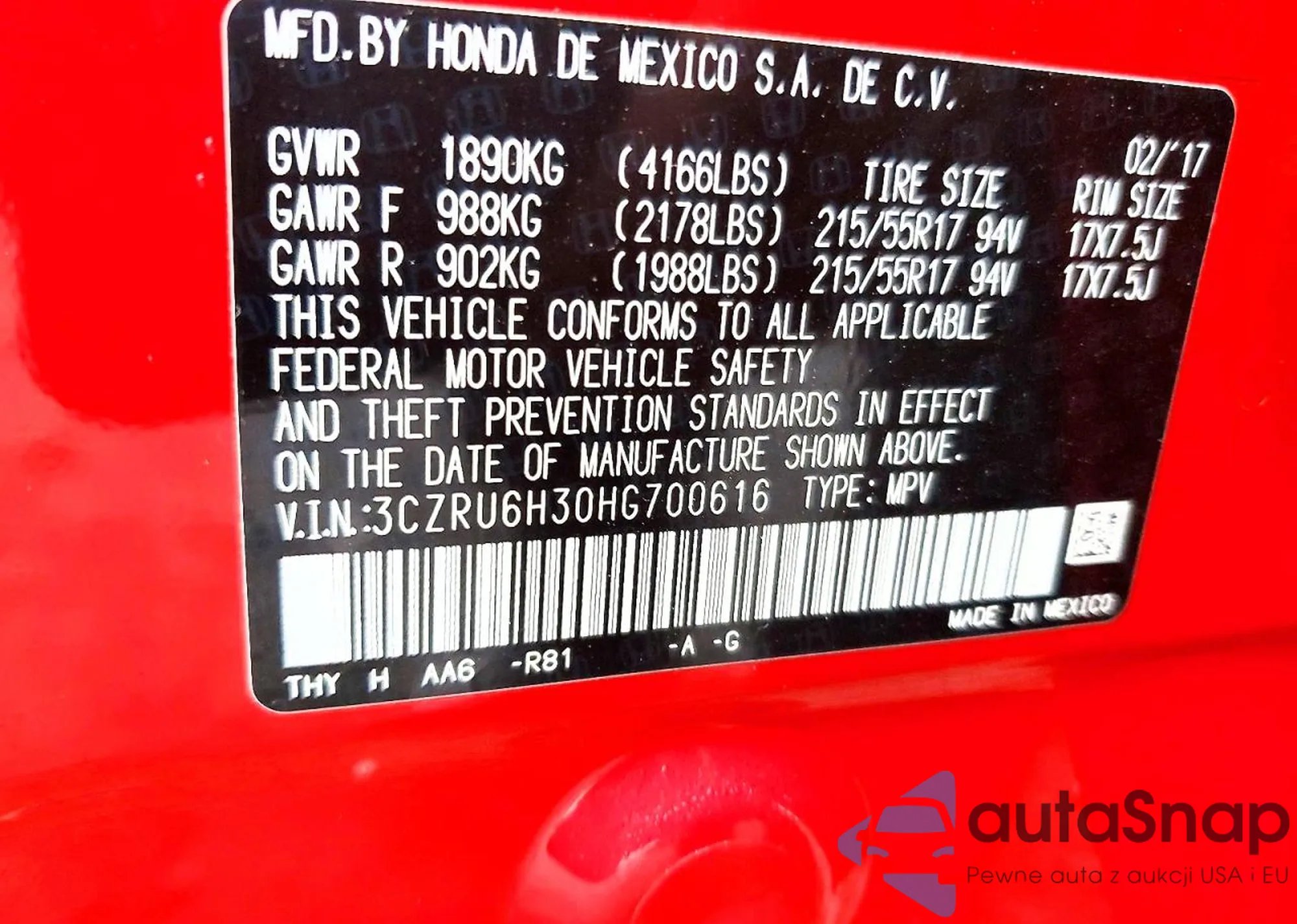 • VIN 3CZRU6H30HG700616