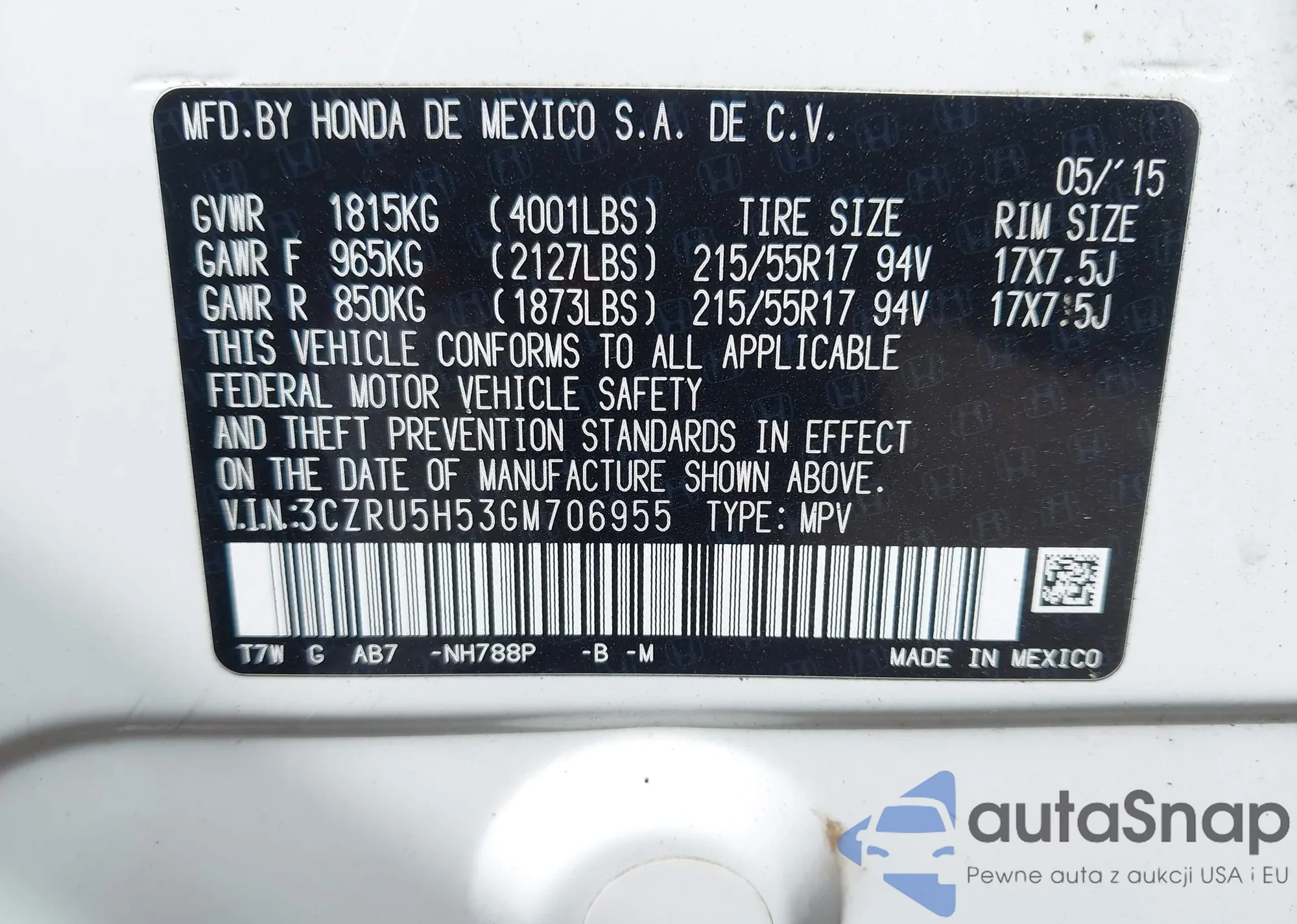 • VIN 3CZRU5H53GM706955