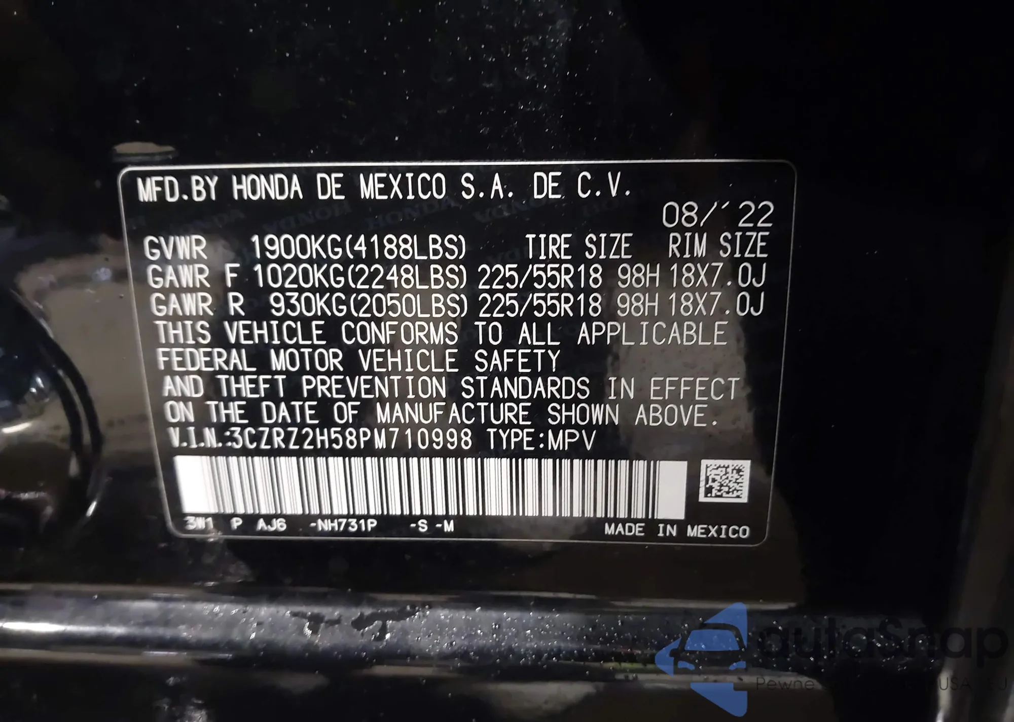 • VIN 3CZRZ2H58PM710998