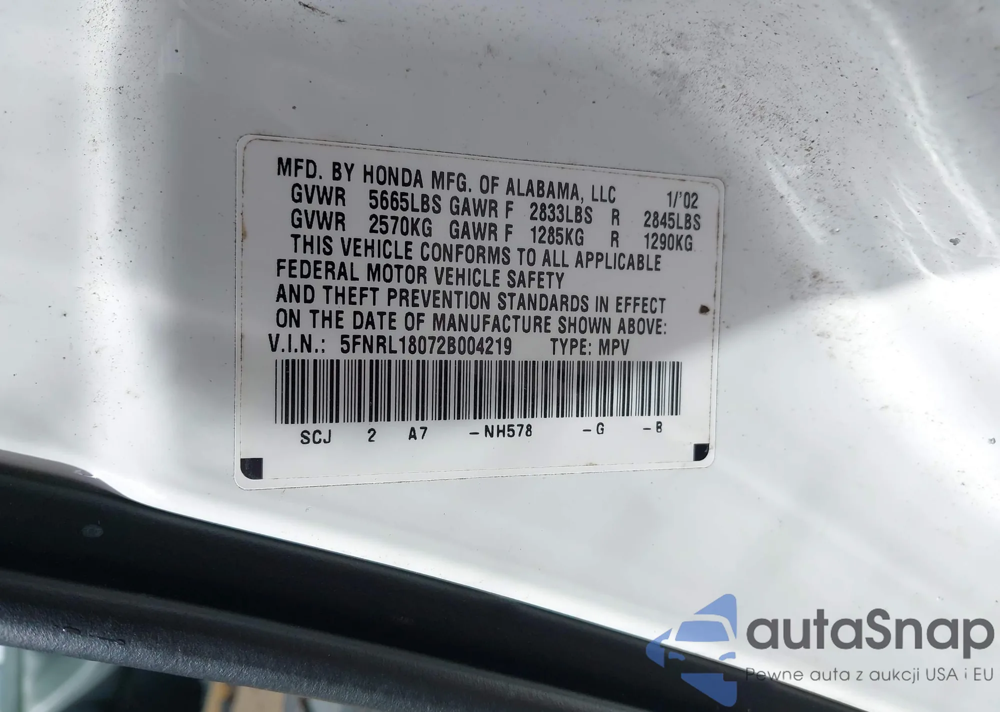 • VIN 5FNRL18072B004219