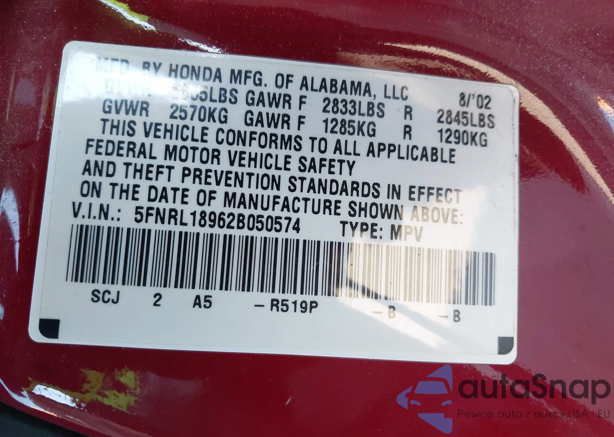 LOT: 44301937 VIN: 5FNRL18962B050574